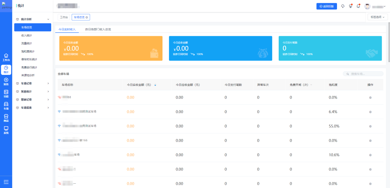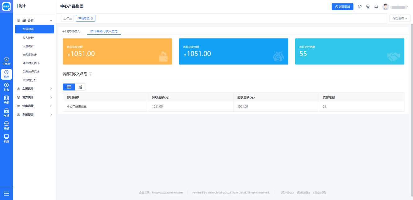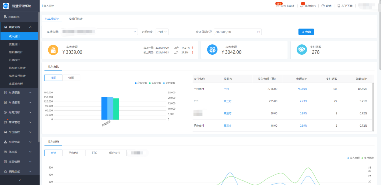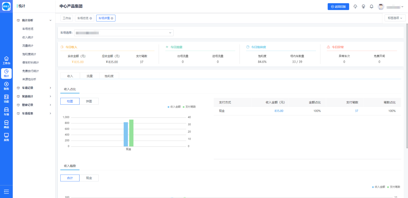可以查看选择全部车场的总收入,每一种支付方式的总收入以及各个车场在总收入中的占比情况;