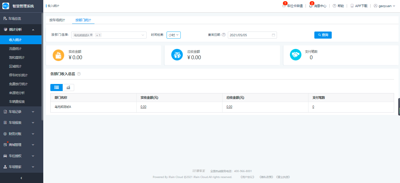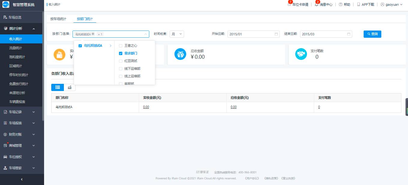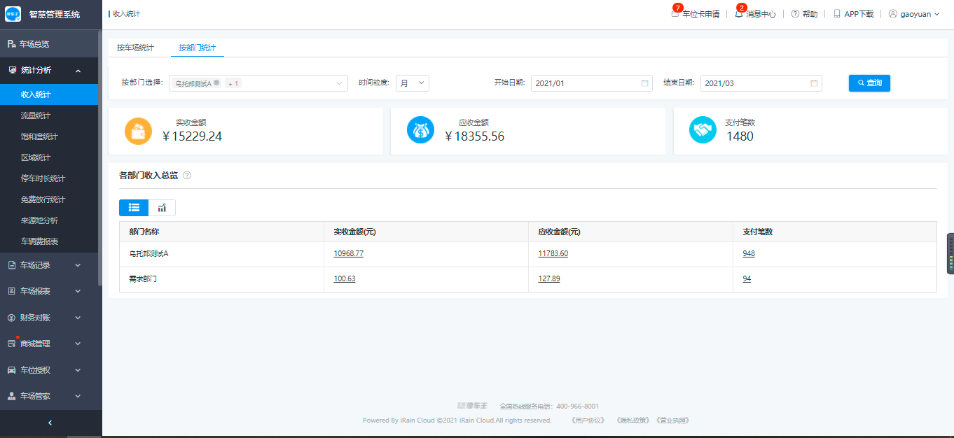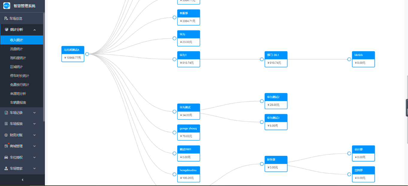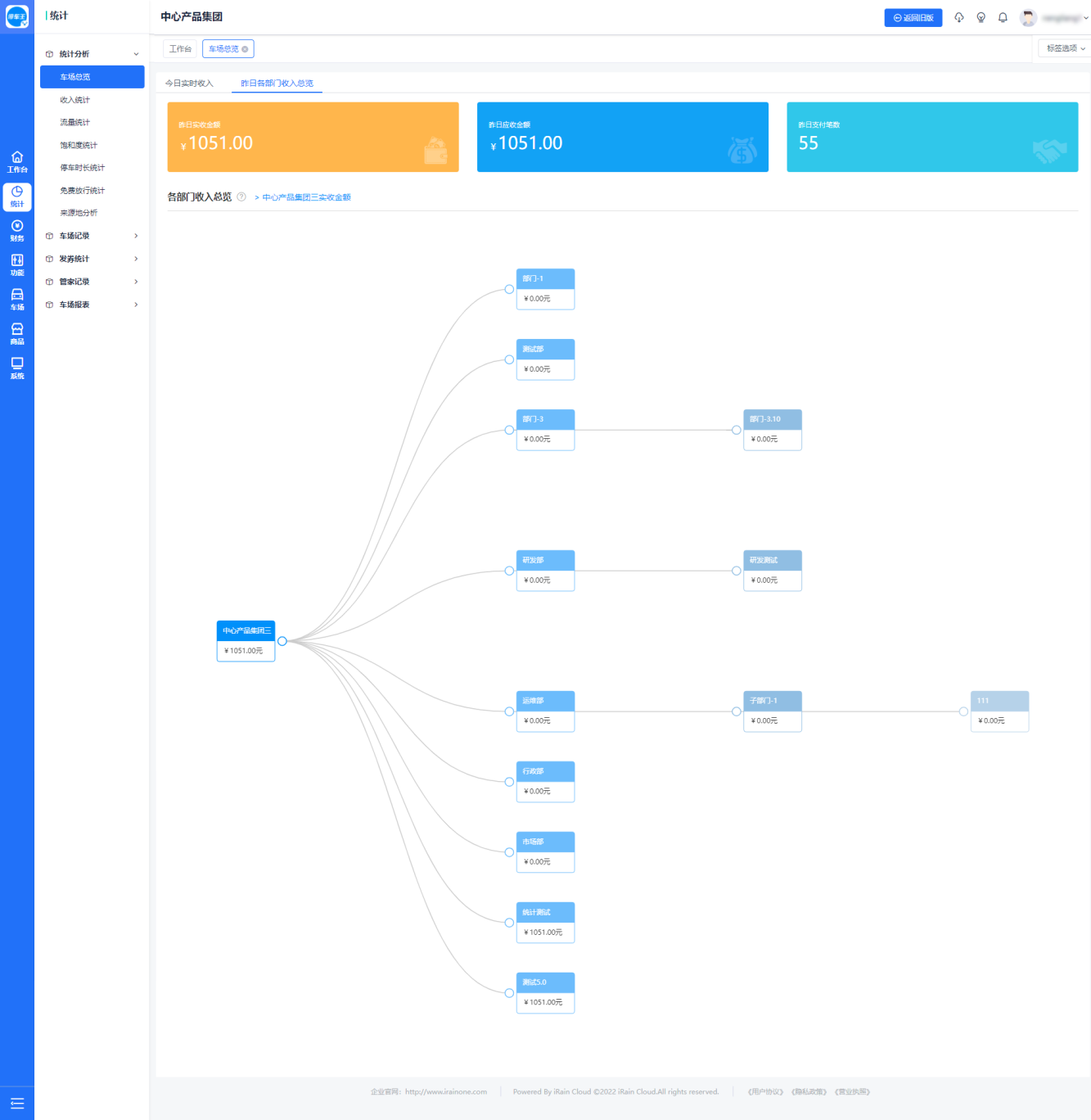 例如:1级部门有A、B、C、D四个车场各实收25元,总实收100元,2级部门2.1有A、B、C三个车场,2.2有B、C、D三个车场,2.1总实收75元,2.2总实收75元,1级部门总实收100元。
