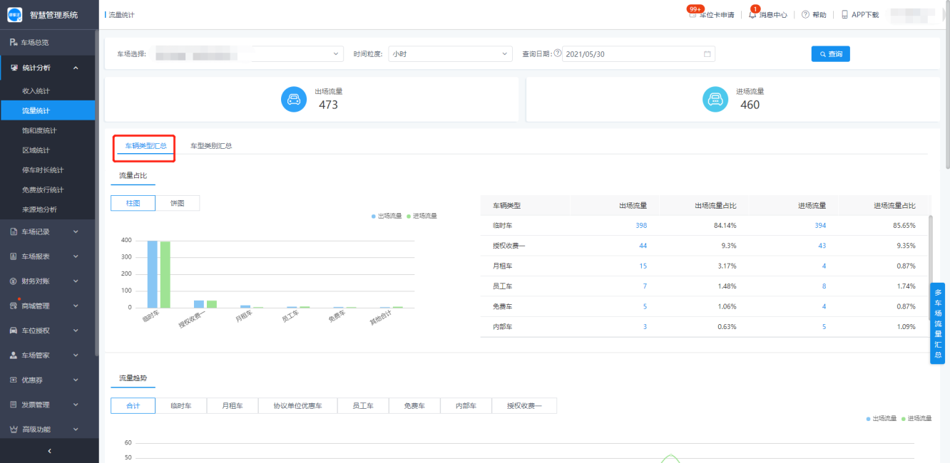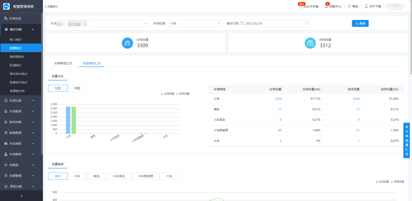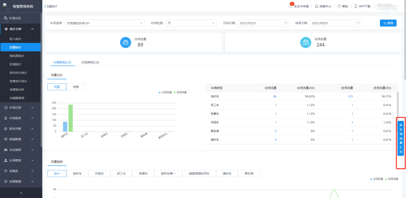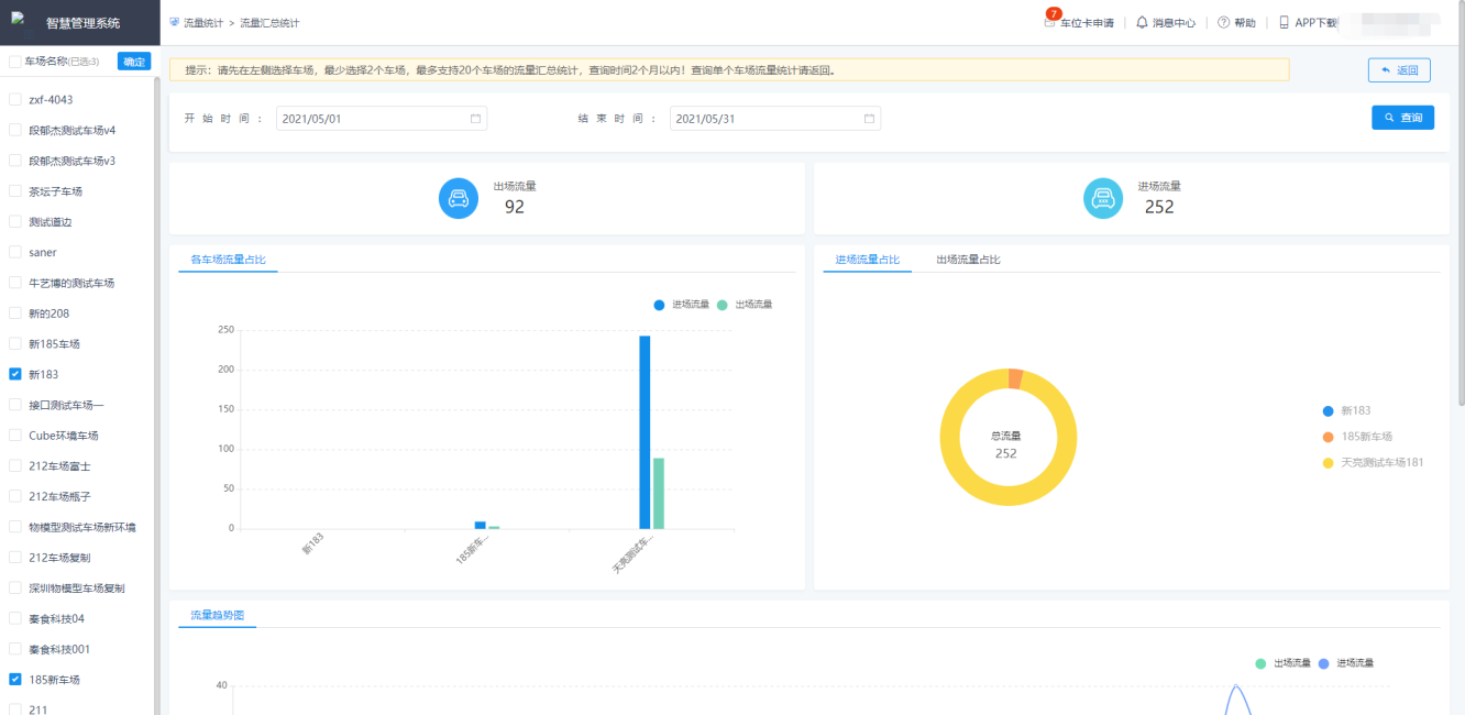 即可统计查询时间范围内,选择车场的流量汇总数据,流量趋势图,以及选择的各个车场在整体流量占比;
