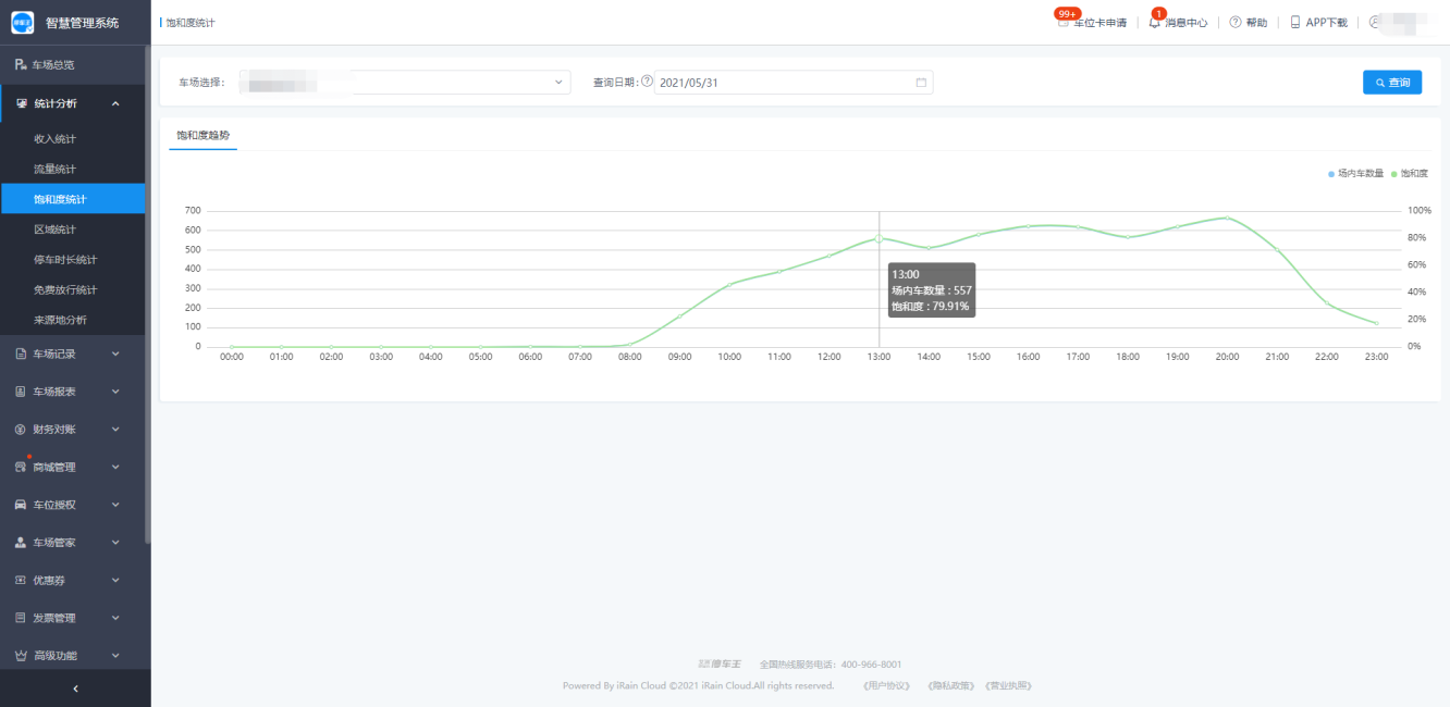饱和度统计可以查询昨天以前(包括昨天)每一天车场的饱和度趋势情况,饱和度统计仅支持按天选择;