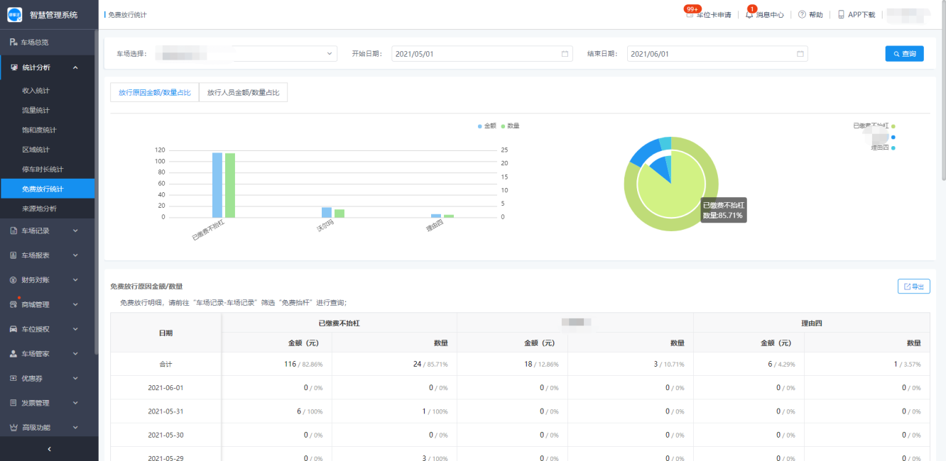 免费放行统计分析中,可以查看免费放行总数,各个免费放行理由的占比,各个放行人员放行次数占比情况,以及每日免费放行数据占比情况统计;