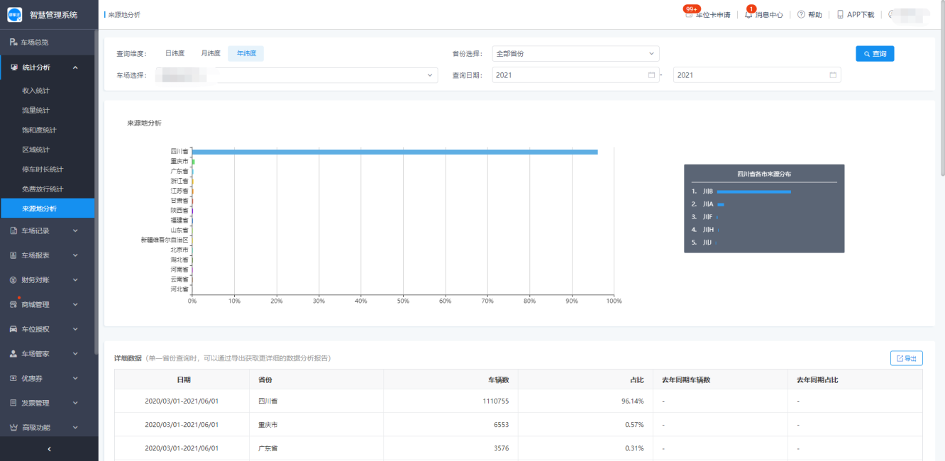 来源地分析可以查询一段时间内的车辆来源地占比情况,支持按日维度、月维度、年维度查询。