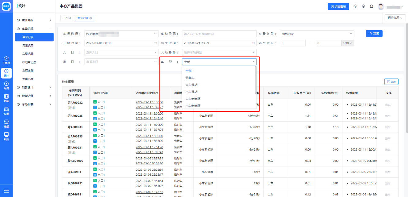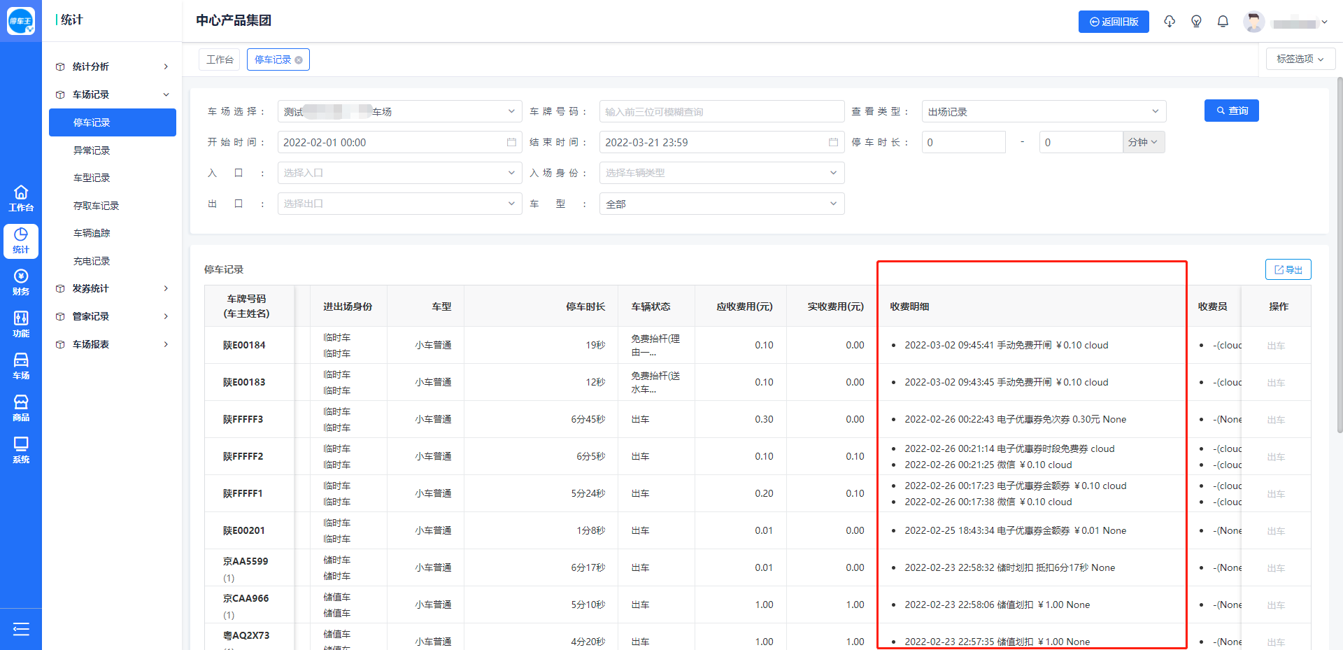 场内支付:场内车有过场内支付行为时,可以在进出车记录中查询到该车辆的场内支付明细。