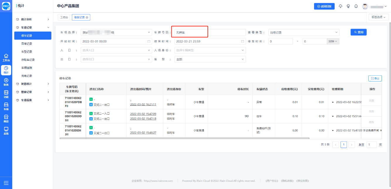 入场记录:查询时间内入场的所有车辆记录。与”当前场内车”的区别:查询结果包含已经离场的车辆记录;
