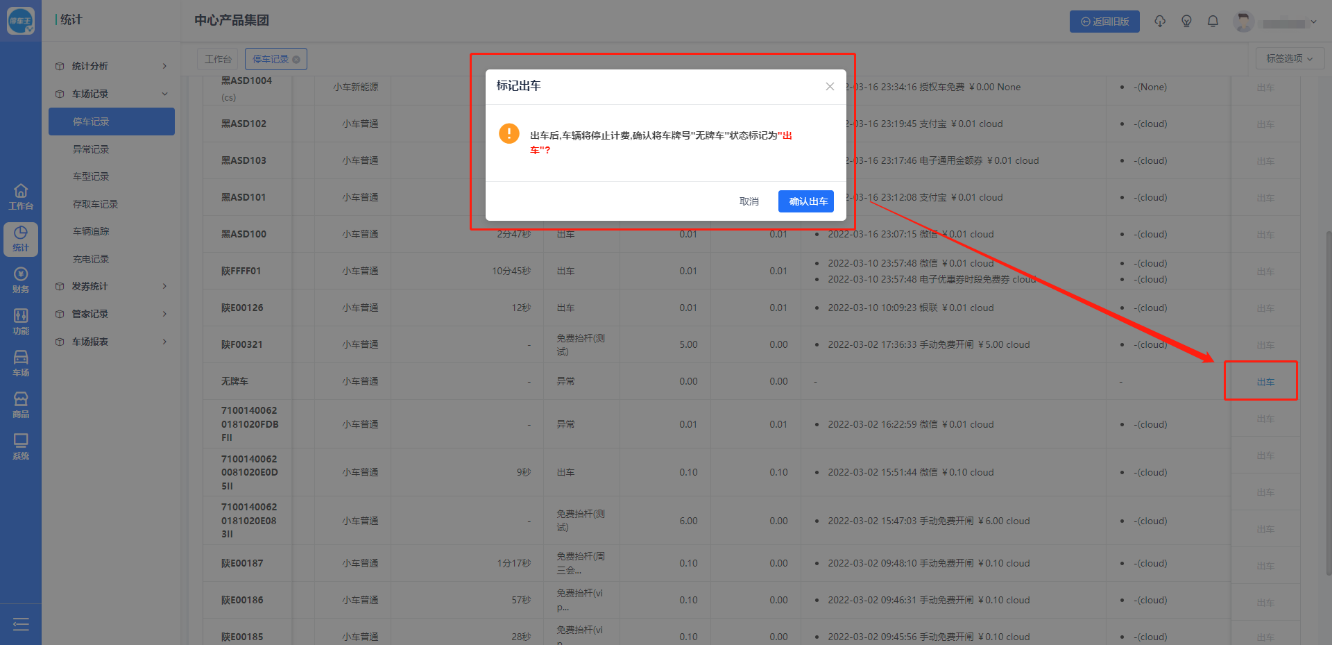 车辆跟车出,车场巡检人员已经确认车辆不在场内,但系统无法获取到车辆的车出信息未更新车辆状态时,车场管理人可以手动将场内车标记为“出车”状态。标记出车后,被标记车辆的本次停车会停止计费。
