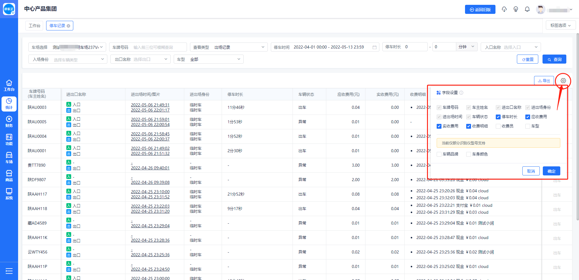 点击停车记录列表右上角设置按钮,选中的字段会显示在列表中。