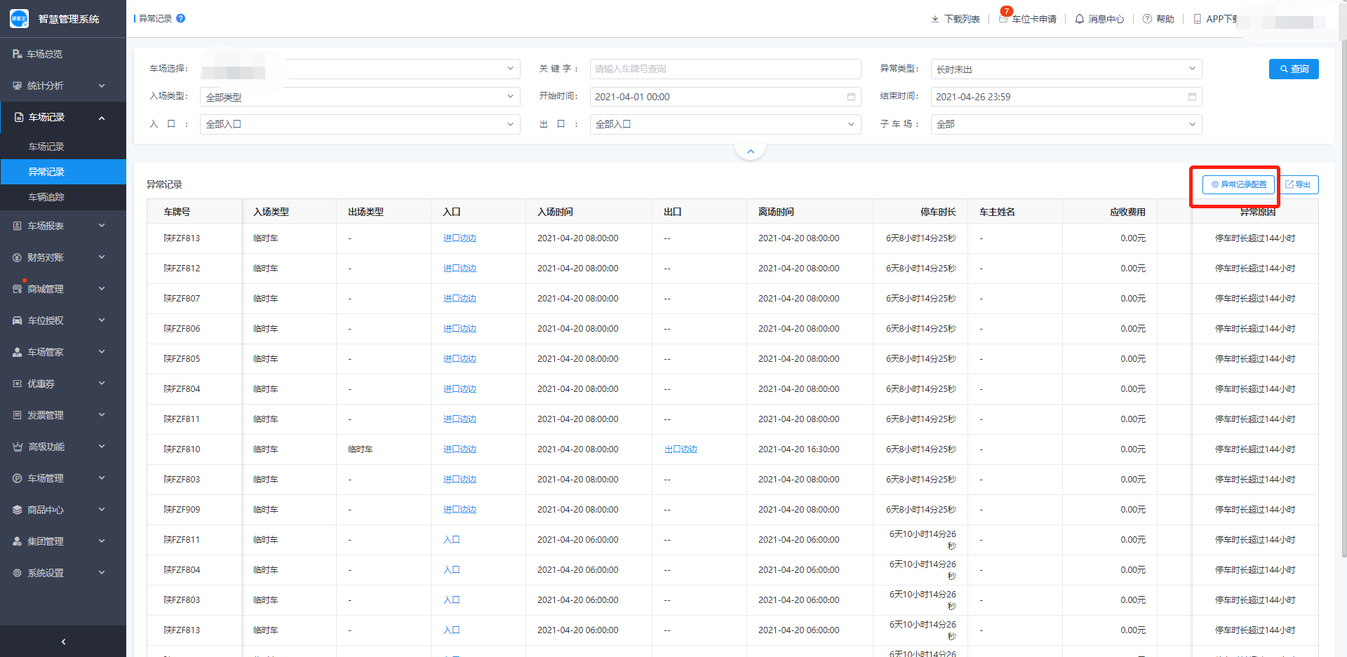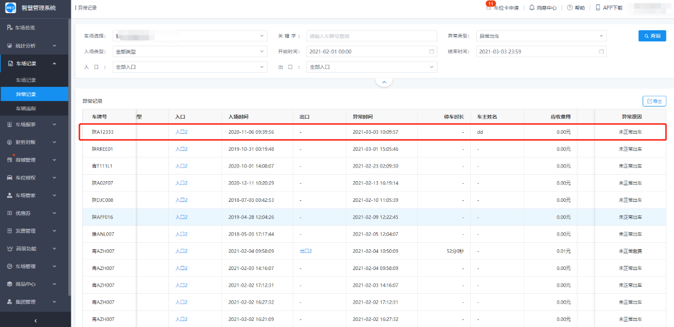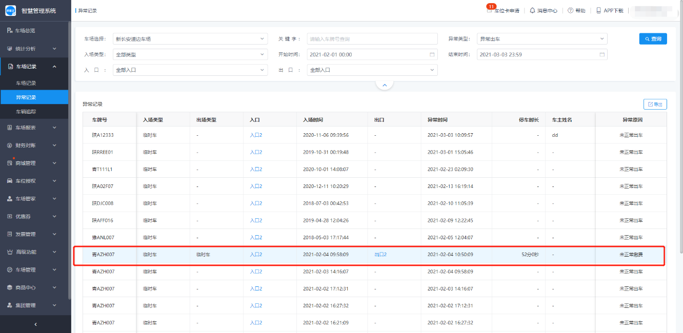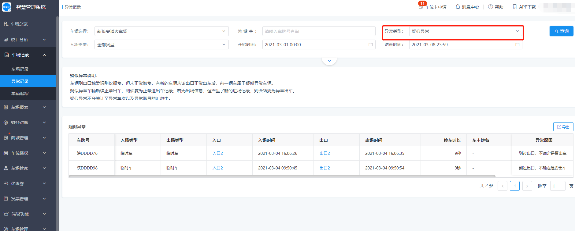 支持按照车场、进出车时间、出入口以及异常类型筛选查询异常记录。