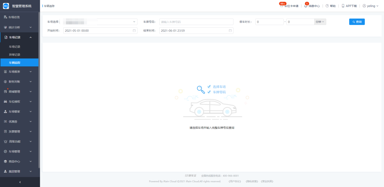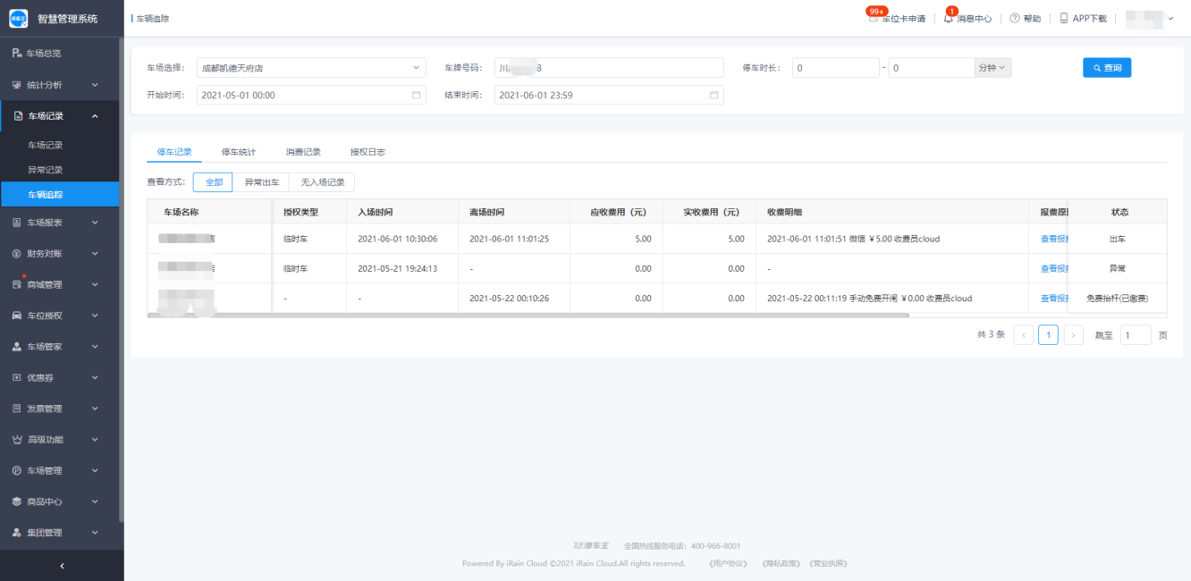 车辆追踪输入车牌后,可以查询一段时间内该车牌在当前选择的车场的所有停车记录、停车记录统计以及所有的授权信息。