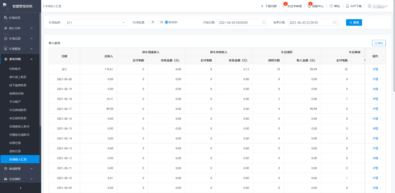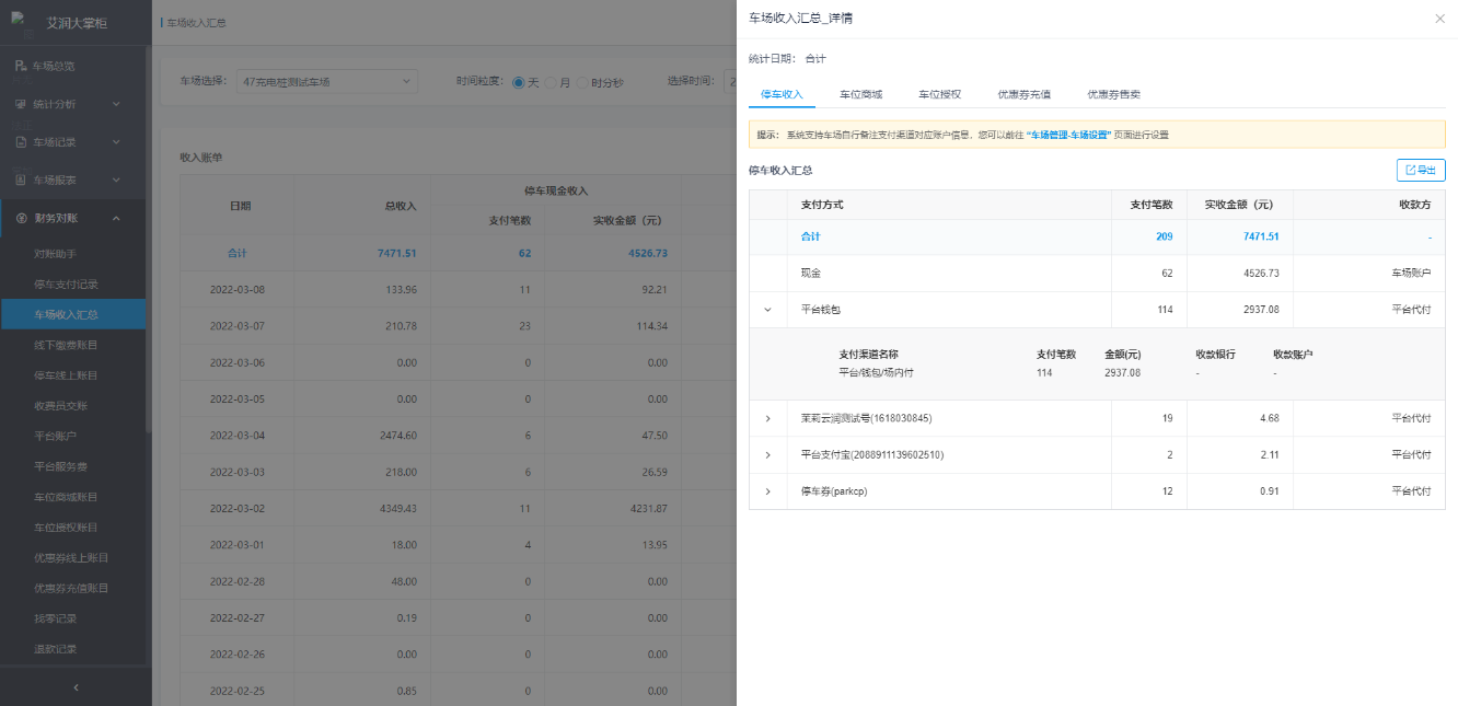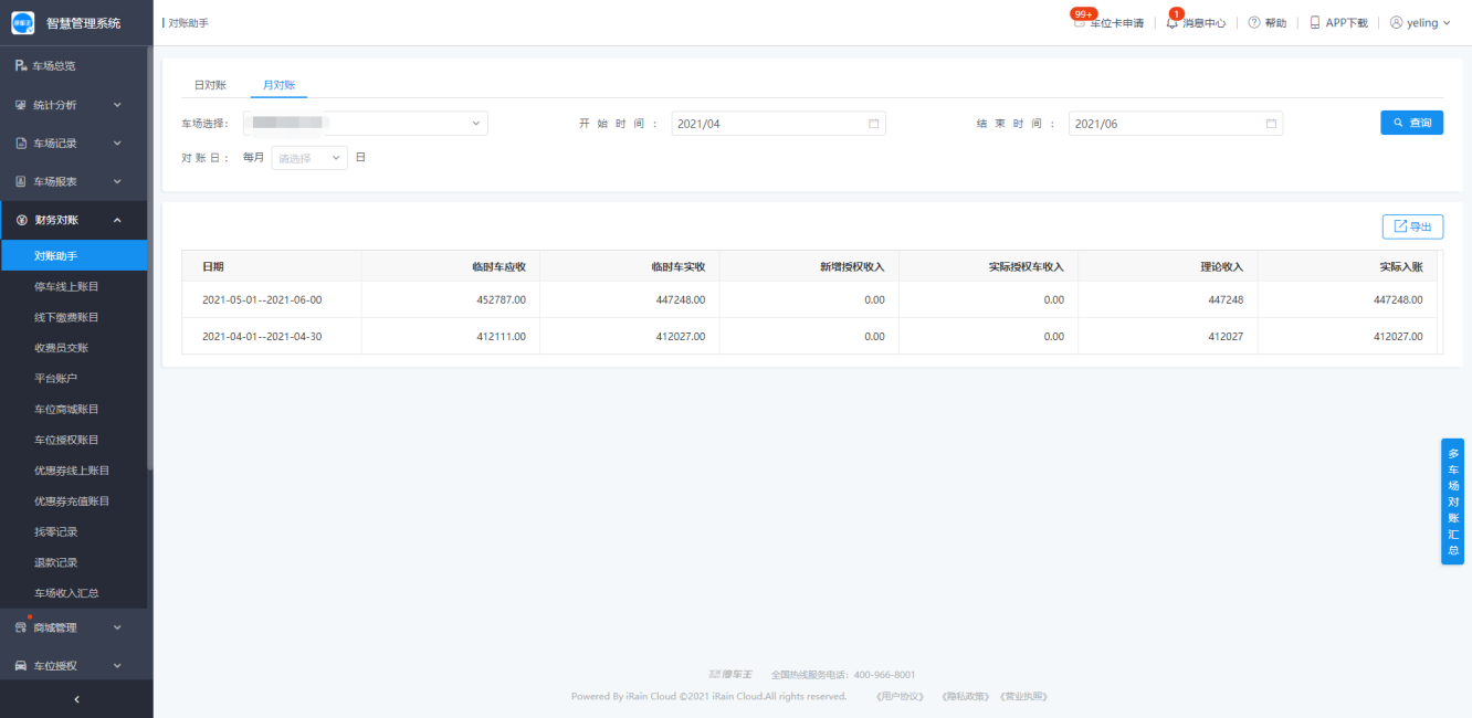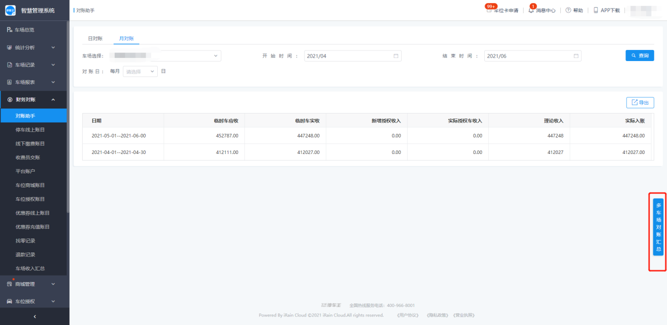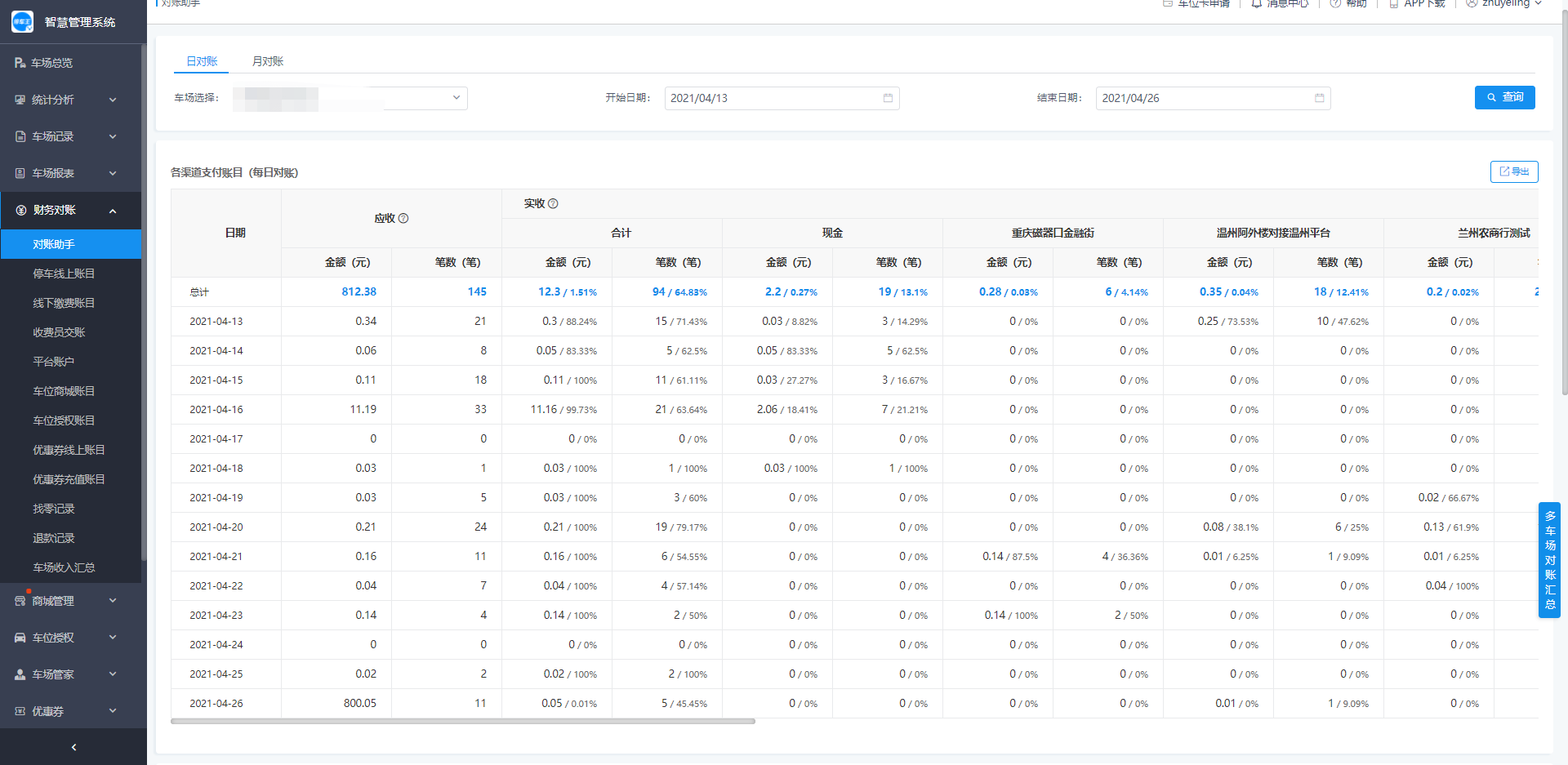 对账助手提供了车场停车费的汇总报表数据,为车场对账提供便利;