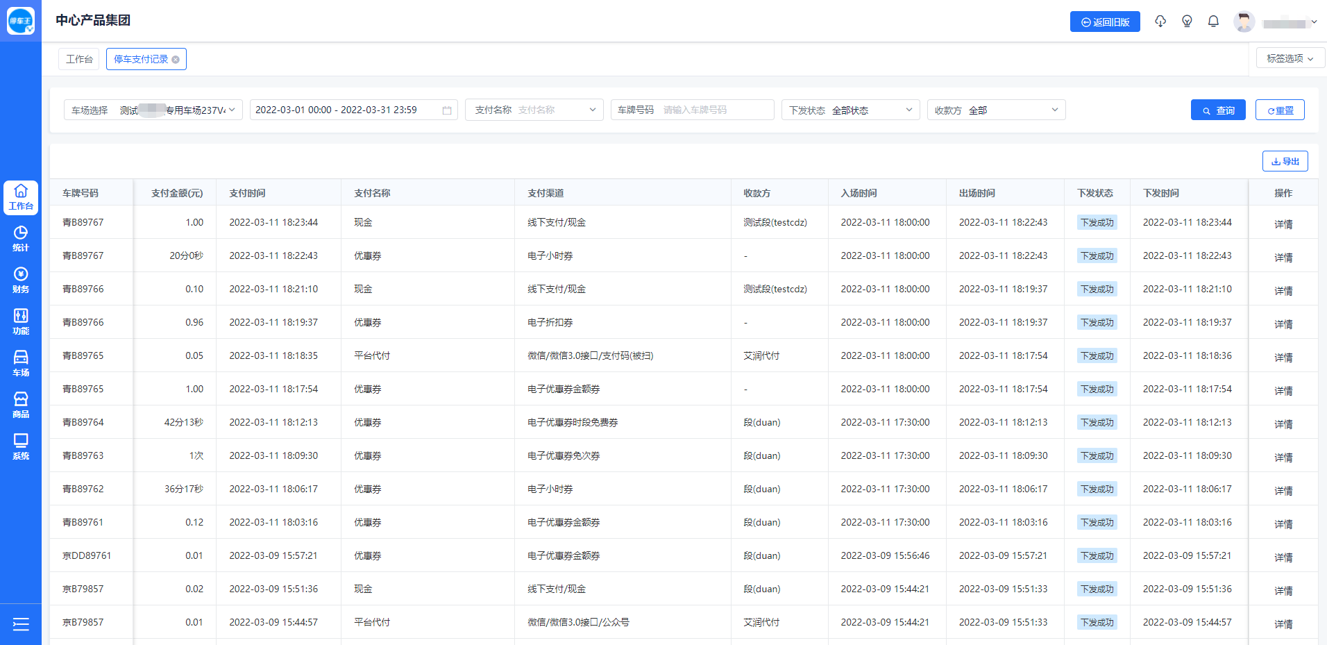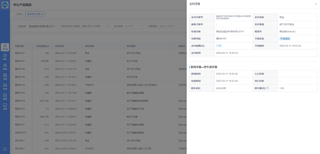 支付订单相关信息:如果支付订单号、支付时间、支付金额、支付名称、支付渠道、收款方、车牌号码、支付下发状态、支付下发时间……