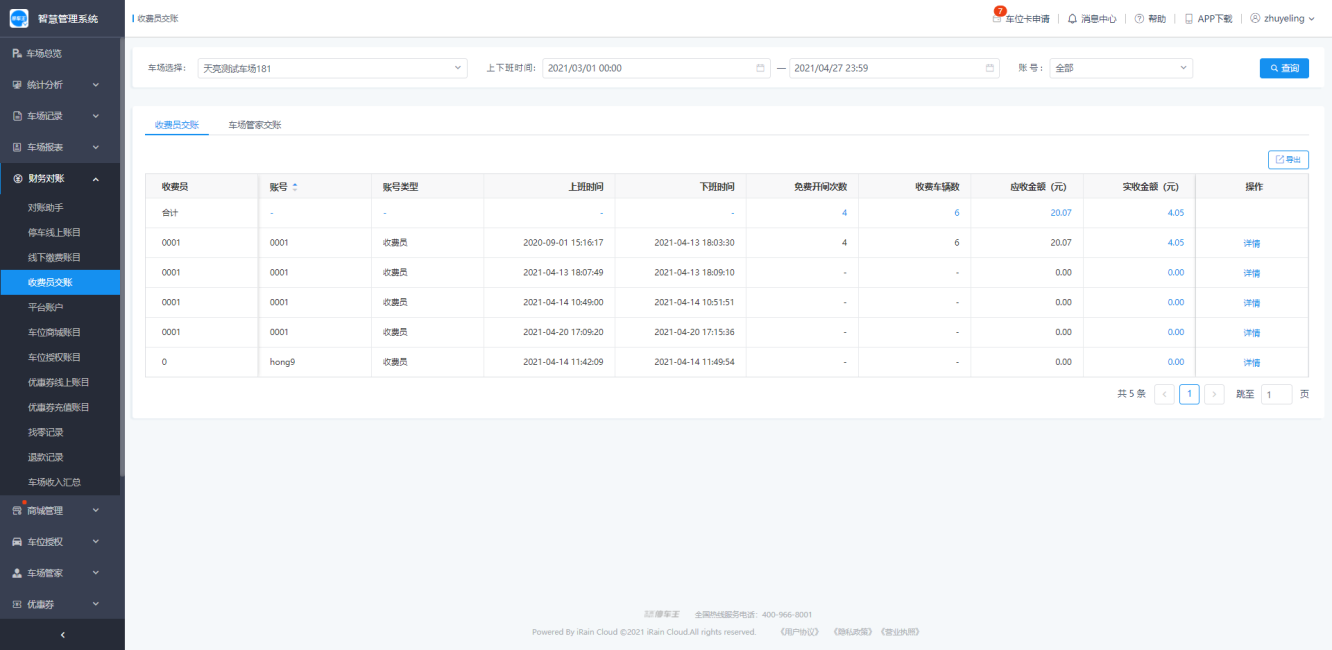 汇总对账页面还提供了,查询时间范围内,各车场收费员的免费开闸以及应收实收金额汇总数据;