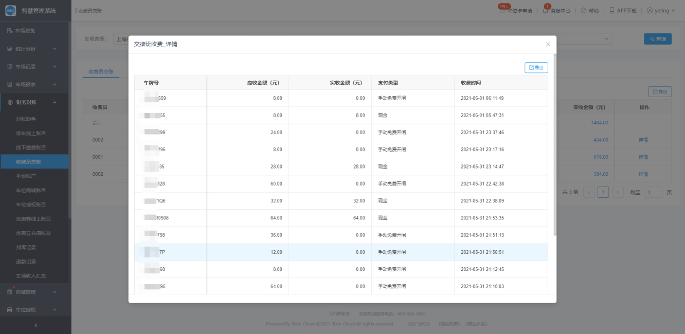车场管理员每天交接班时会把现金交给财务,财务需要清楚的知道交接班人员在此次交接班时间段内的应收金额、实收金额,如果实收金额少于应收金额,财务需要看到是否有免费开闸等情况。