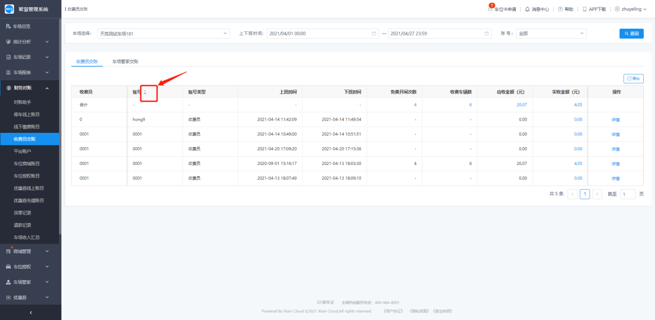 车场管理员为了方便查看收费员交账数据,可以选择按照账号进行排序,将同一个收费员的交接班数据放在一起。