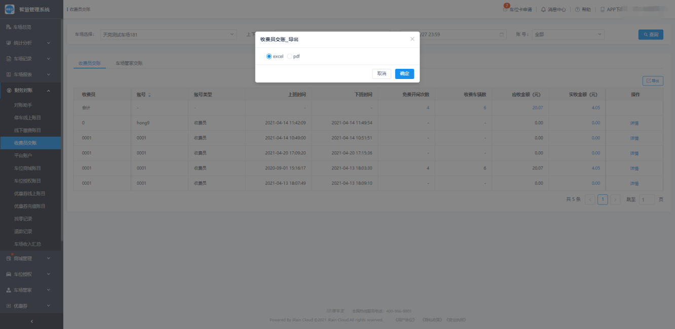 收费员交接班导出时,支持execl和pdf 2种格式,导出的数据和列表的排序一致;
