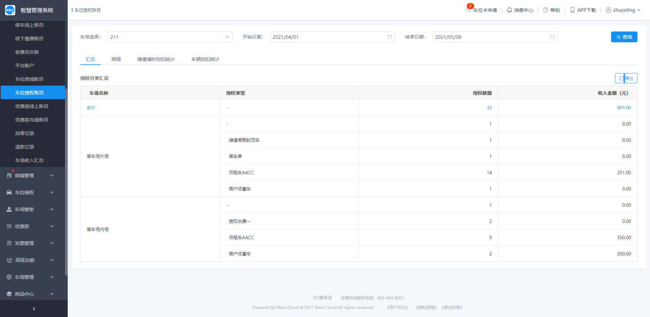 汇总中按照授权类型维度统计了每一种授权维度下的授权账目金额和笔数汇总;如果是嵌套车场,则支持查看嵌套子车场中每一种授权类型账目的汇总信息。