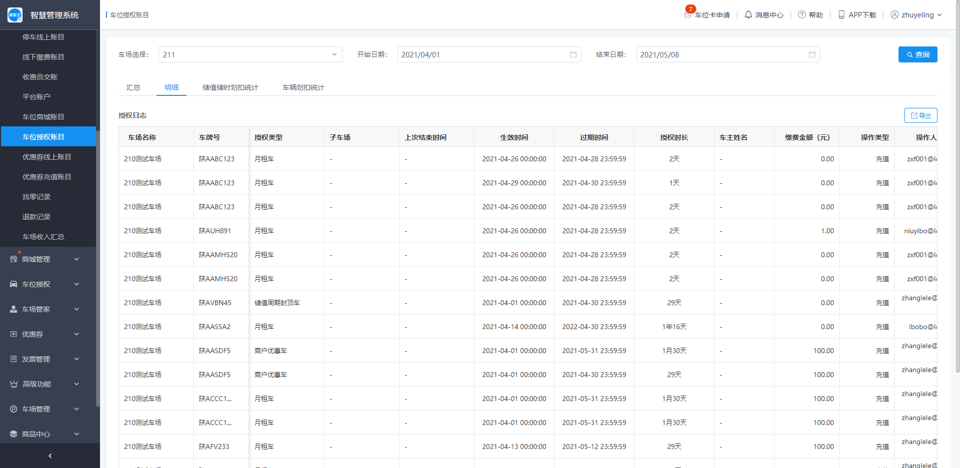 明细中可以查看每一笔授权账目的明细信息,包括授权类型、车牌、有效期、操作人,如果是嵌套车场,还会显示嵌套子车场信息。