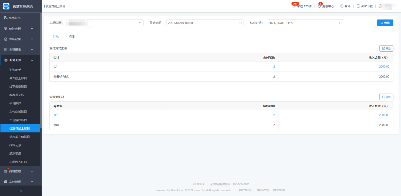 优惠券线上账目汇总分别从渠道(APP端、web端),优惠券类型2个维度进行统计汇总,汇总指定车场在指定的查询时间范围各渠道的优惠券收入汇总,以及各个类型的优惠券线上销售汇总;