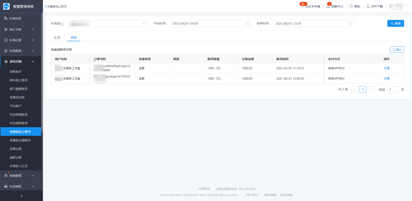 商户购买线上购买优惠券的钱会支付到车场配置的线上账户中;