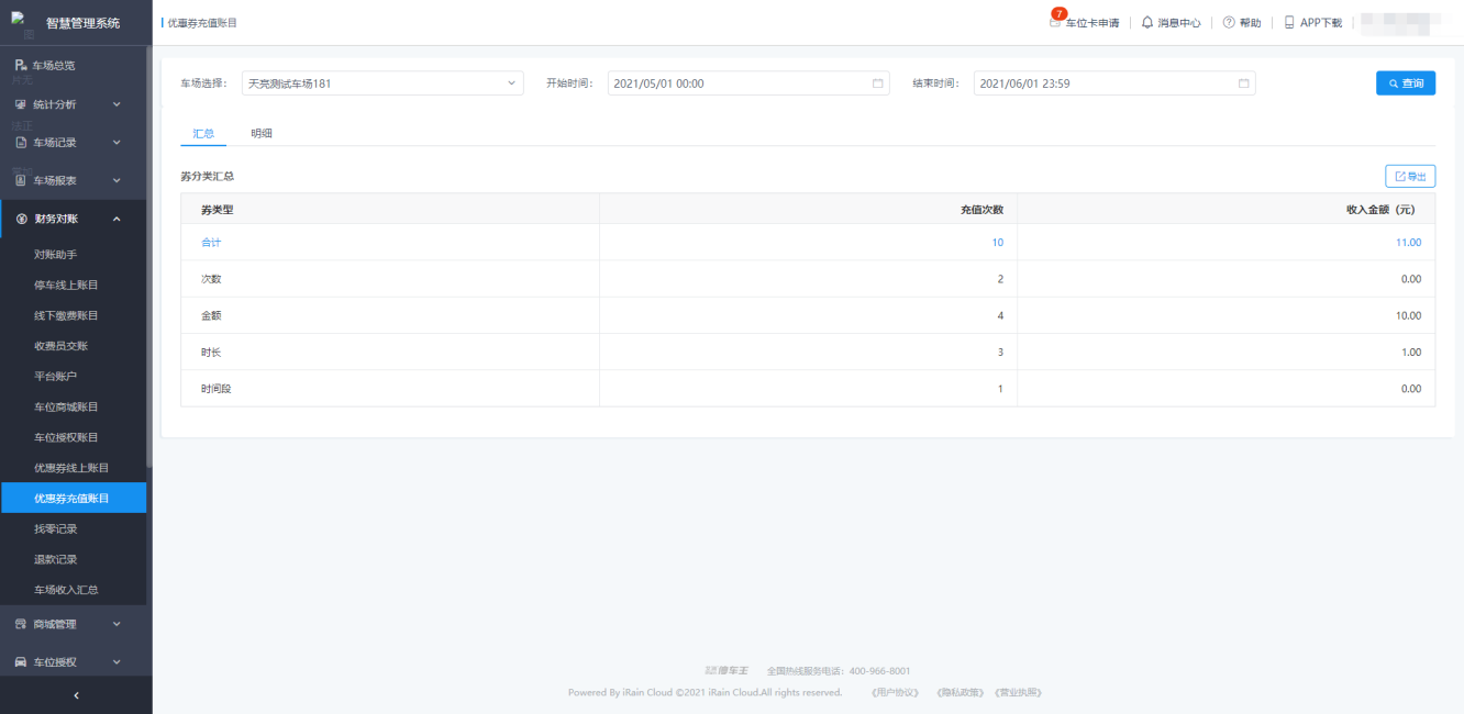 优惠券充值账目按照券的类型提供了汇总的充值次数和收入金额,选择查询车场和查询时间即可获取对应查询范围的优惠券充值账目汇总信息;