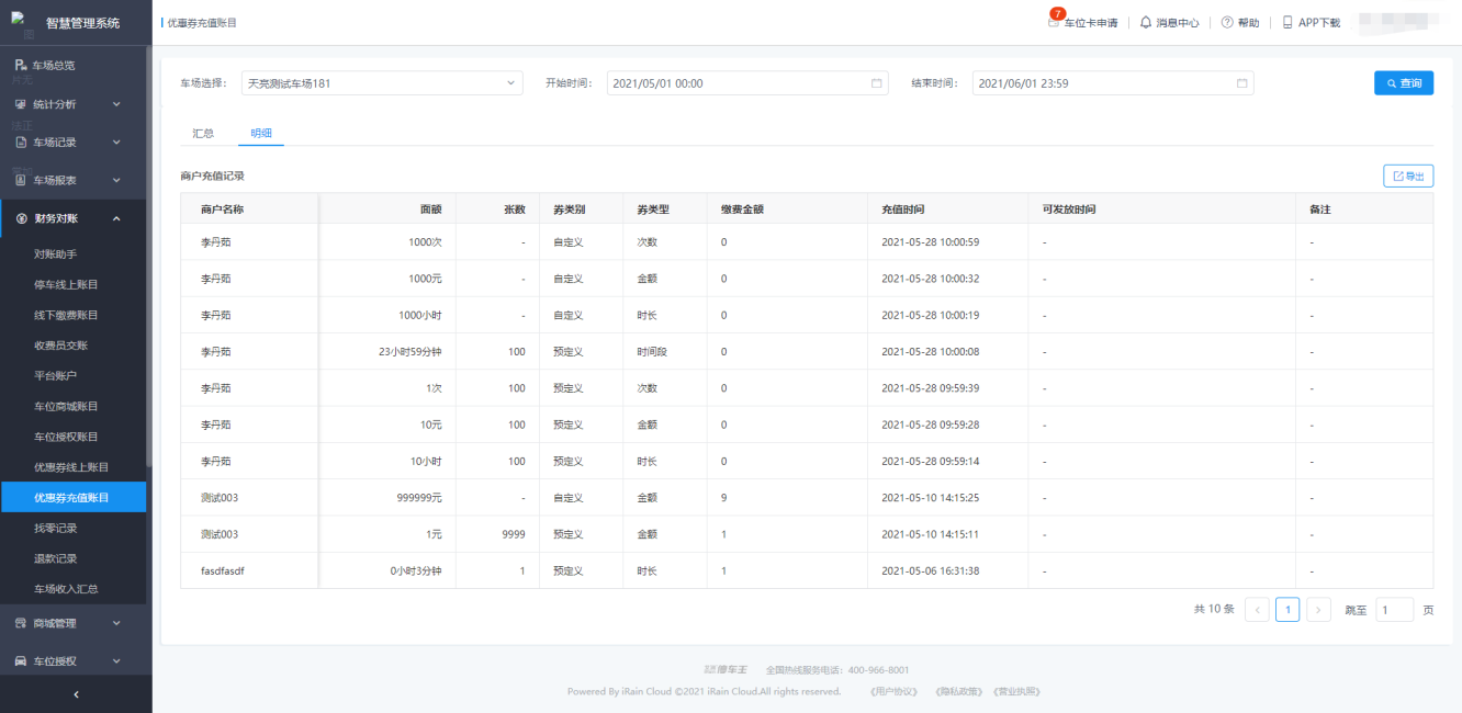 商户充值优惠券收入明细记录,则详细记录了商户充值的优惠券类型、时间、面额、金额等;并支持导出操作;