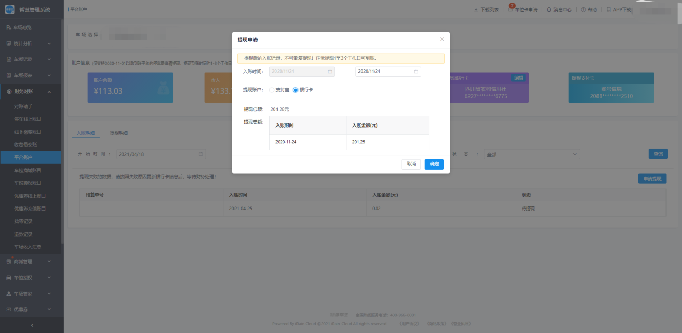 在“入账报表”中点击“申请提现”按钮,提现时,只能从当前最早未提现的入账时间开始选择,车场用户选择提现到期时间,确认提现的区间后,确认需要提现的明细,点击确认后,即可成功提交一个提现申请。