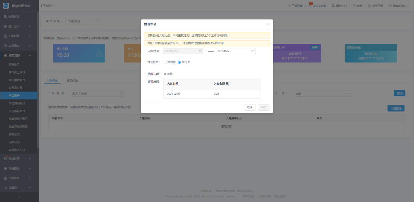 提现之前,每一个车场需绑定一个提现的银行账号,提现的钱,将会到车场绑定的银行卡中;