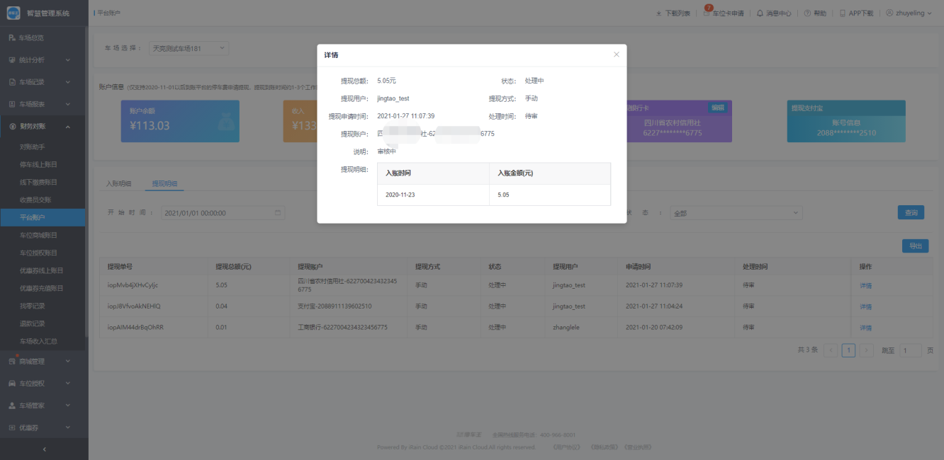 特别说明:提现失败的申请,一般都是由车场绑定的银行卡信息有误造成的,此时车场可以根据返回的失败原因修改绑定的银行卡信息,系统自动更新提现失败状态的提现记录到账信息,由平台财务人员重新处理。