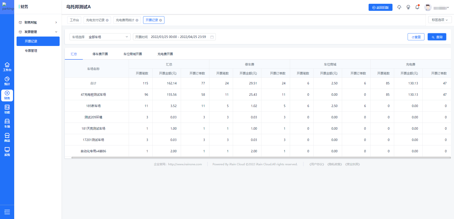 汇总中,分别有停车费、车位商城、充电费的开票笔数、开票金额汇总以及开票订单数汇总信息。