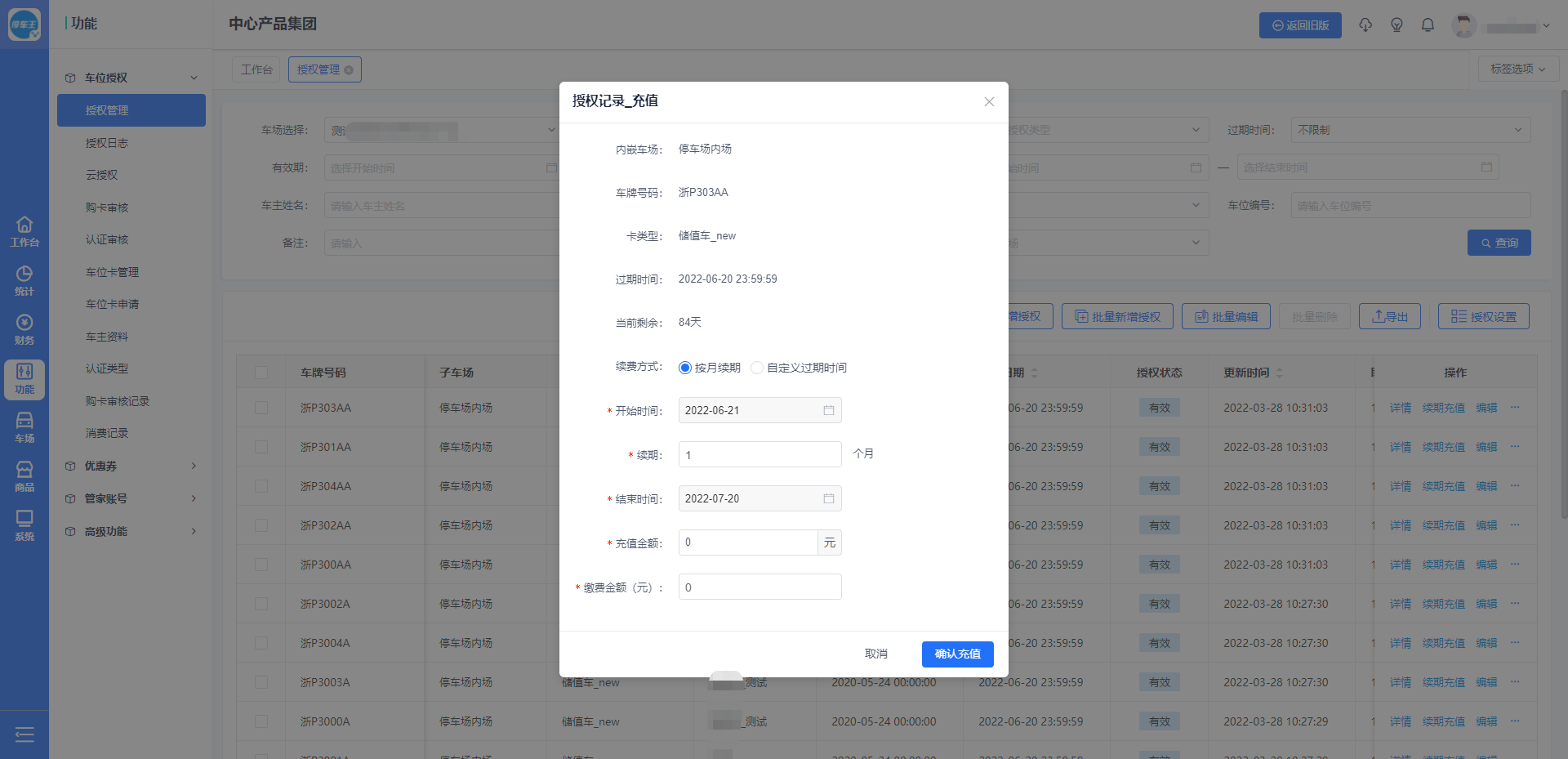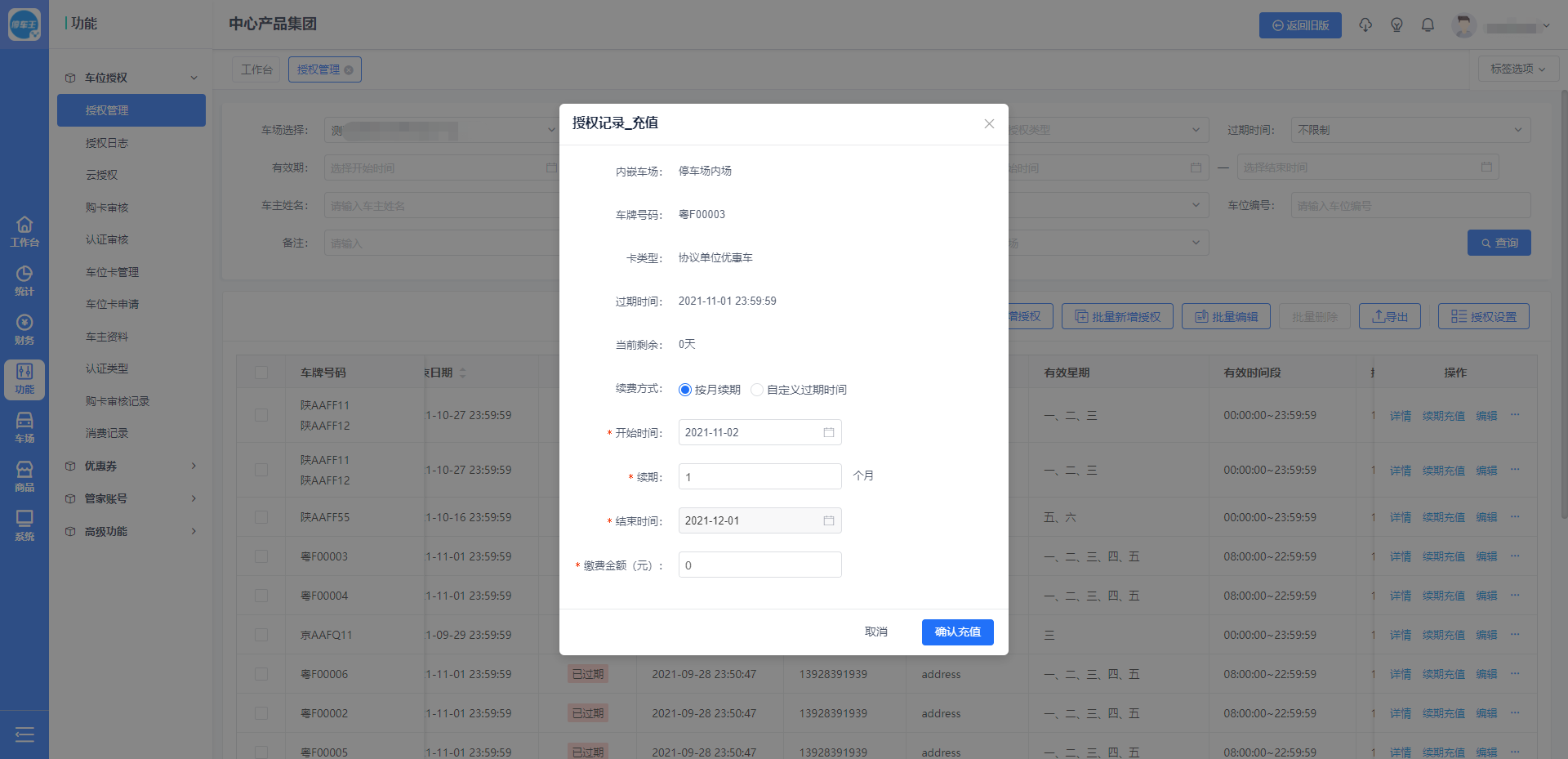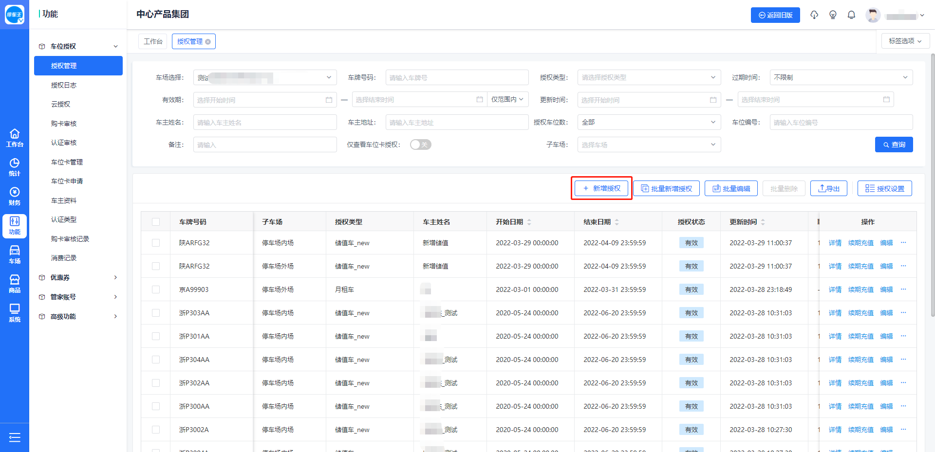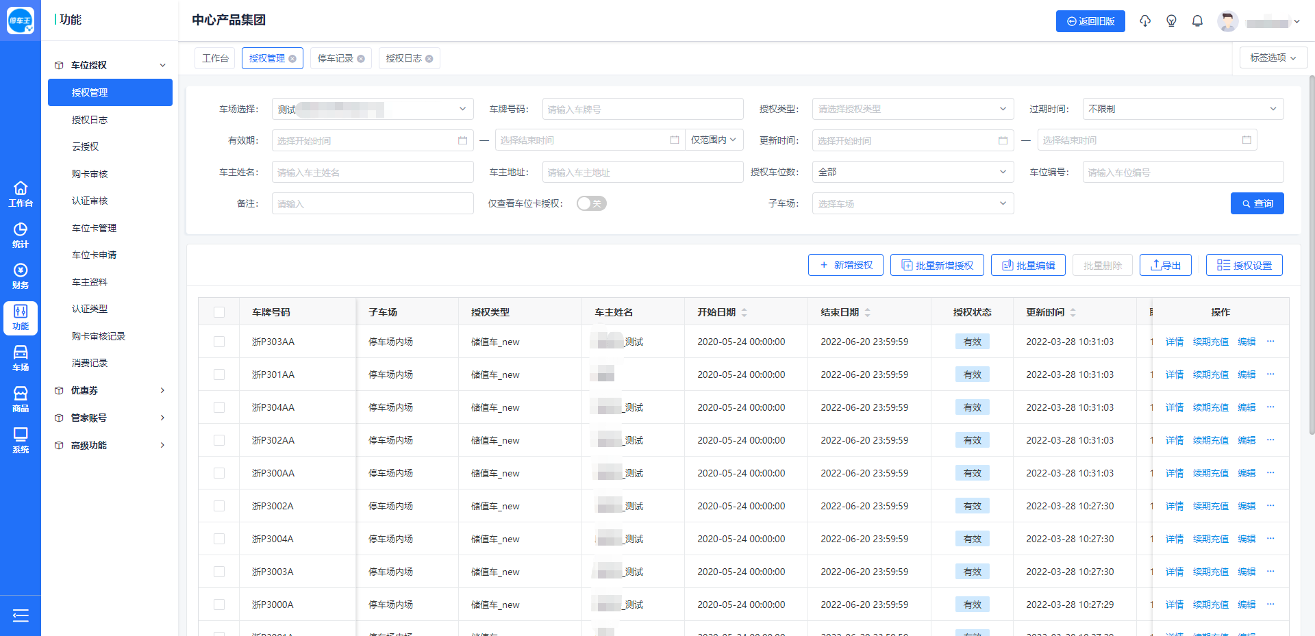 车位授权-授权管理 功能模块,记录了当前车场所有当前可用或已过期的授权信息,您可以在这里进行授权的查询、新增、编辑、续期或充值、以及删除操作。