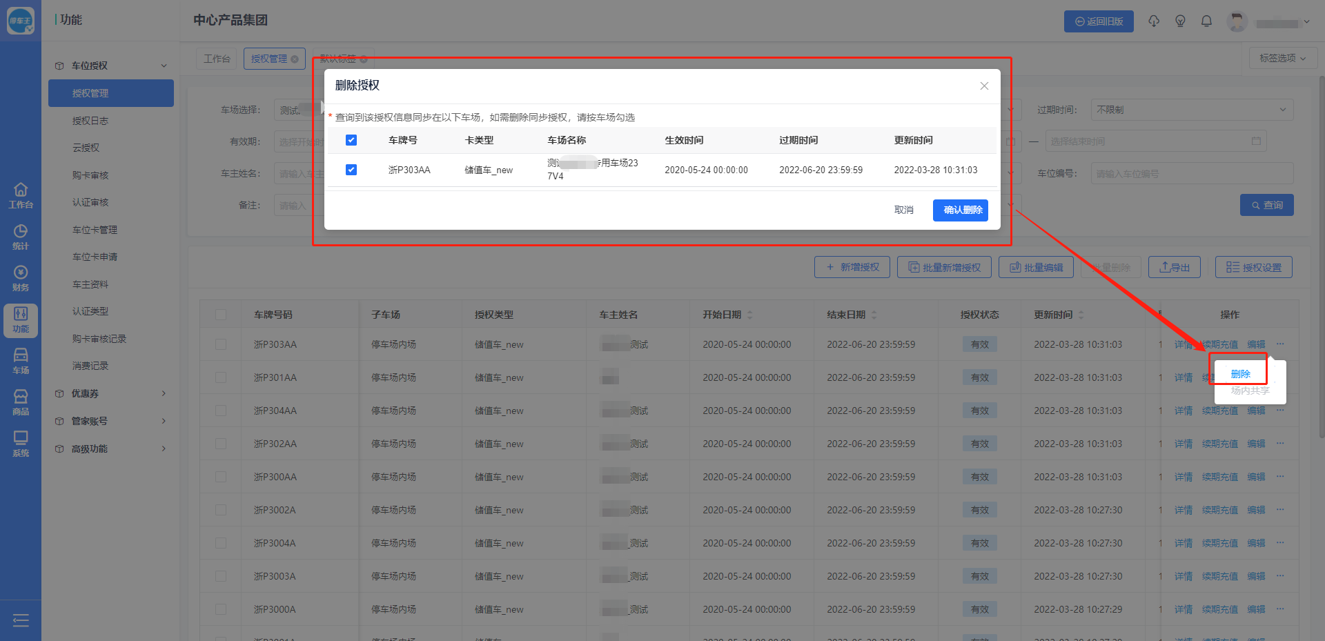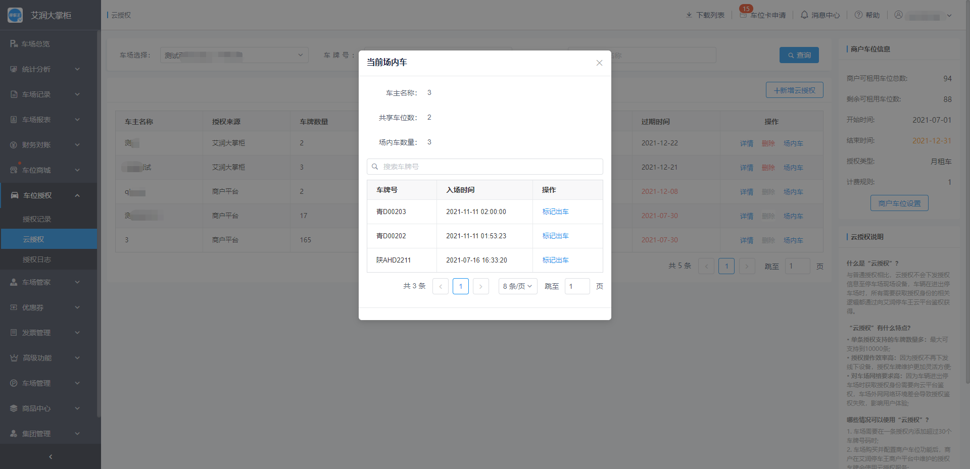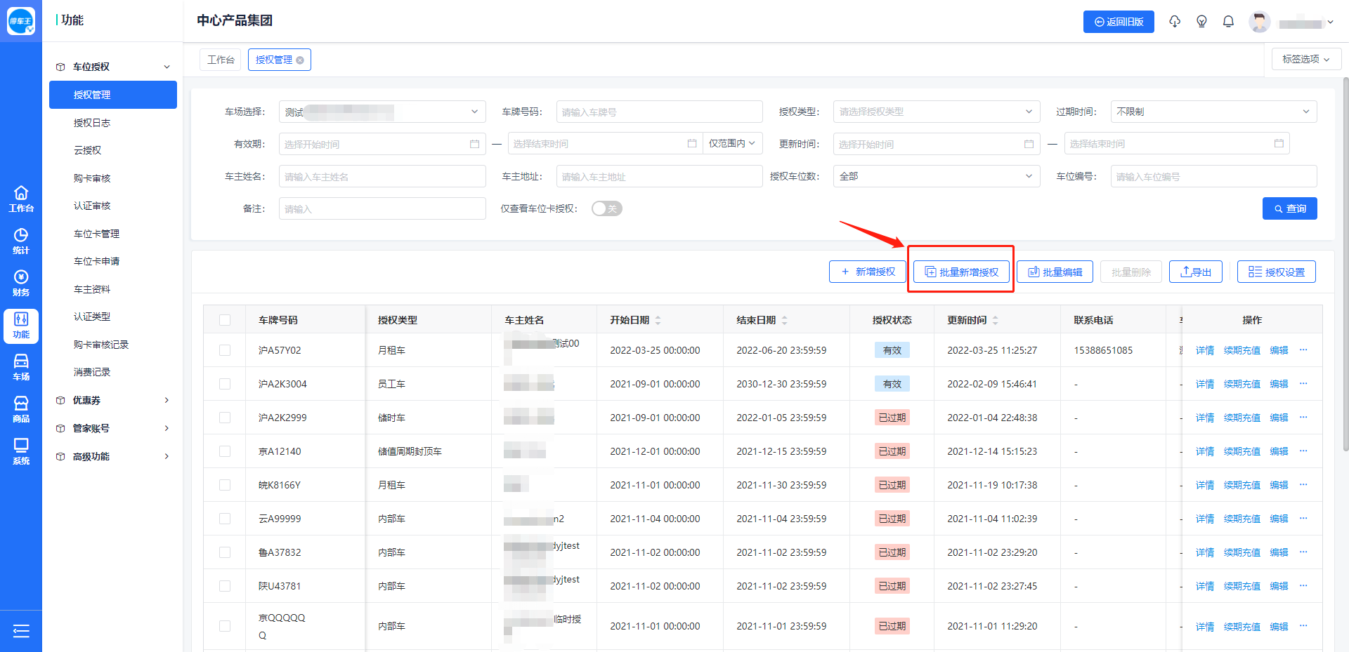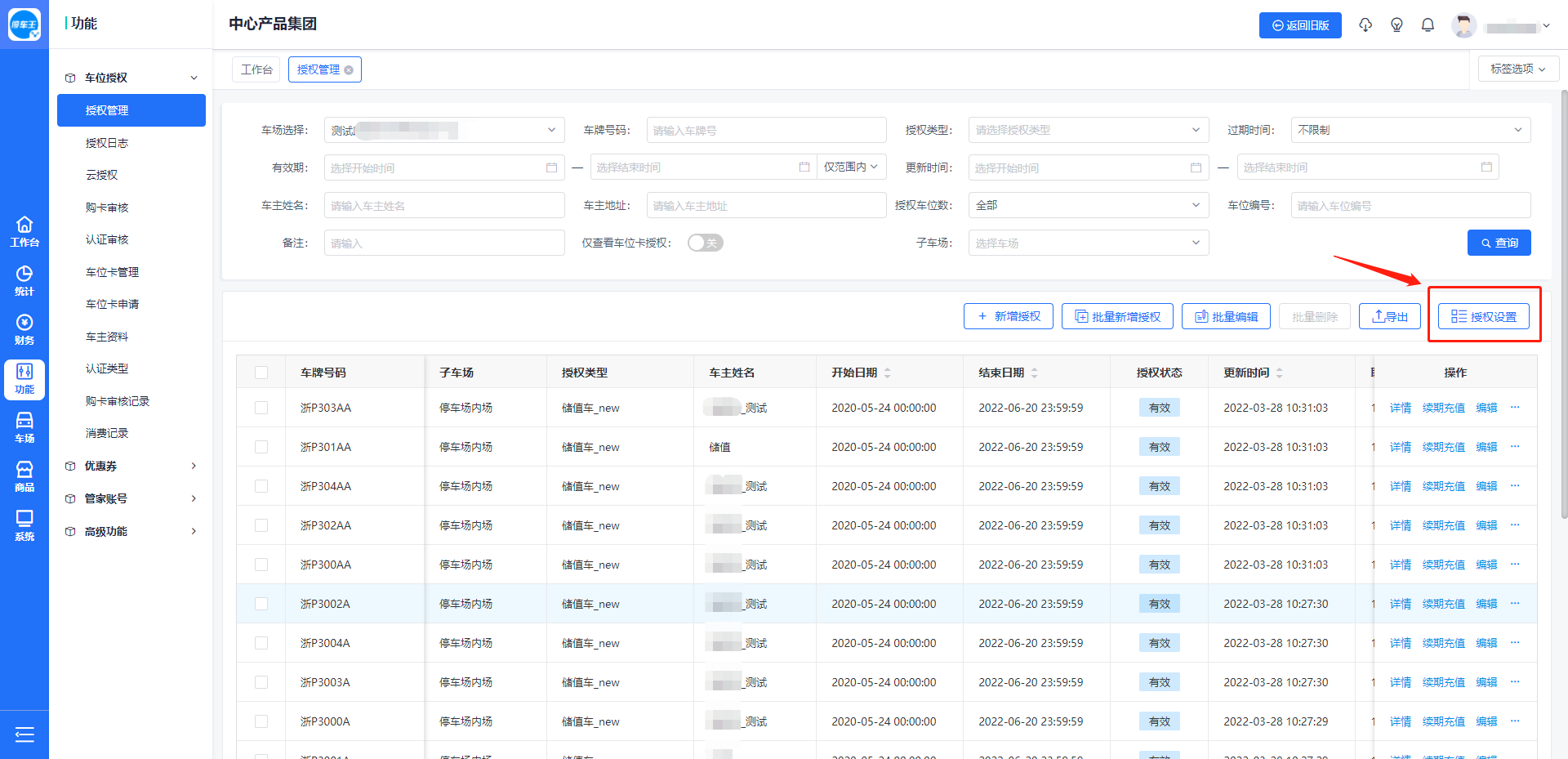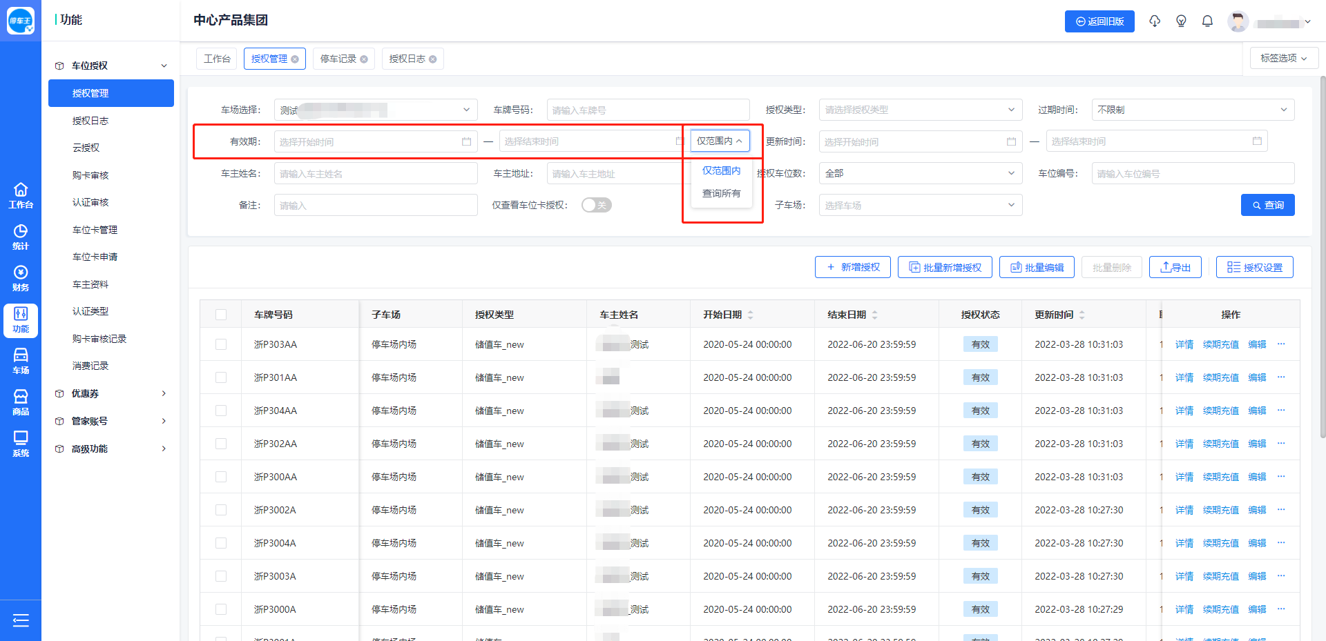 车位授权-授权管理 功能模块,记录了当前车场所有当前可用或已过期的授权信息,您可以在这里进行授权的查询、新增、编辑、续期或充值、以及删除操作。