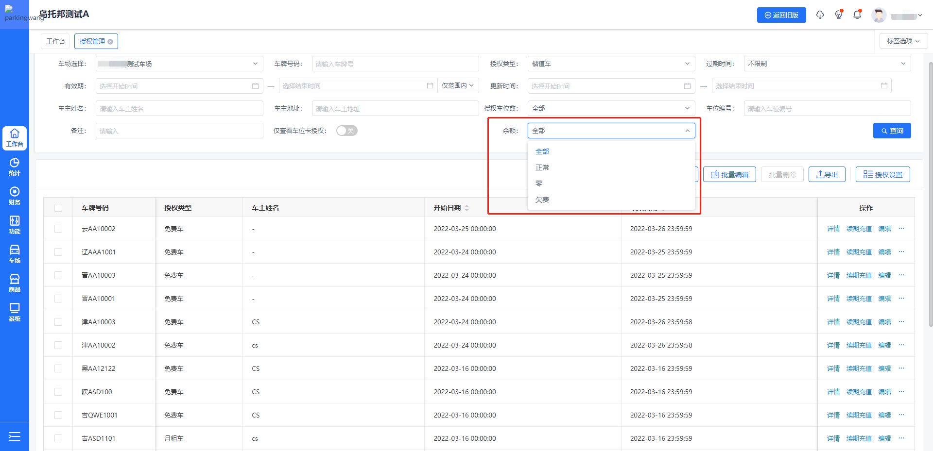 当筛选的查询条件中,授权类型选择:储值车、储时车 或 储值周期封顶车 时,支持按照授权的余额进行筛选查询。