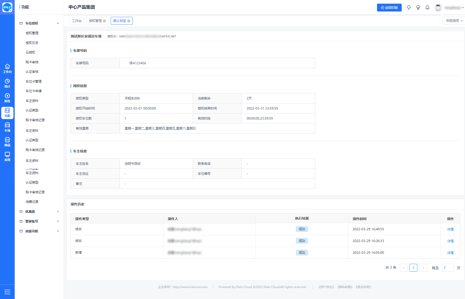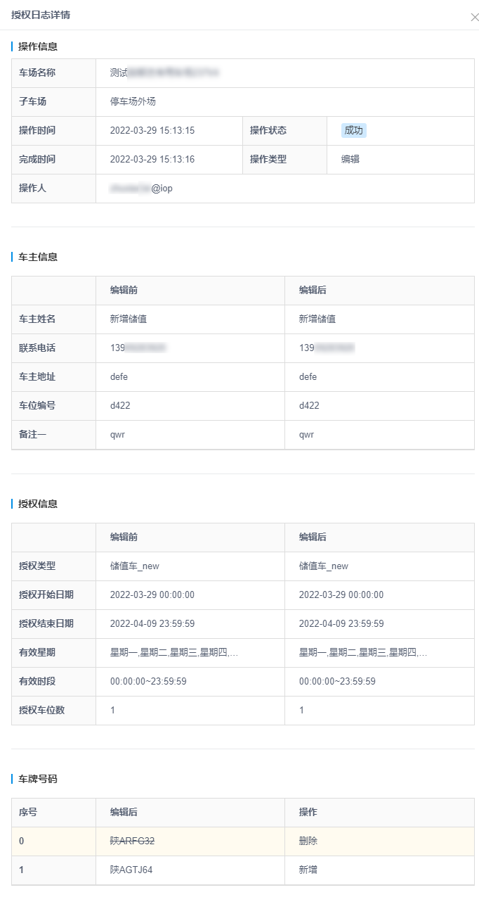 添加成功的车牌就会显示在授权详情页的车牌列表中。车牌列表中的车牌可以随时增、删、改。修改记录可以在系统日志中查询。