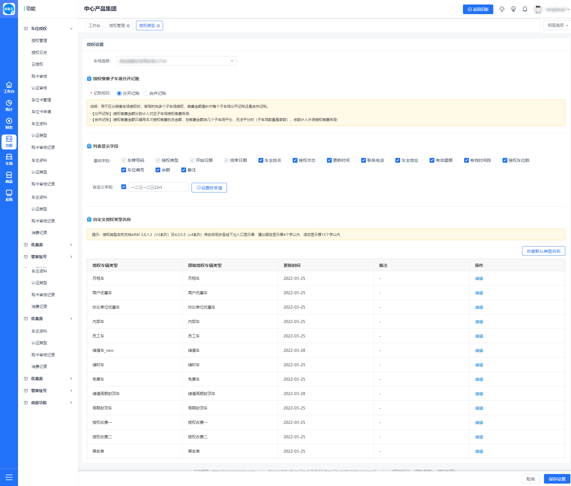 在授权管理页中,您可以设置授权类型的别名,授权管理页面列表的可显示字段,新增自定义备注字段。对于嵌套车场,您还可以设置授权时,缴费金额是由子车场自动平分,或是由授权操作人员手动逐个录入。