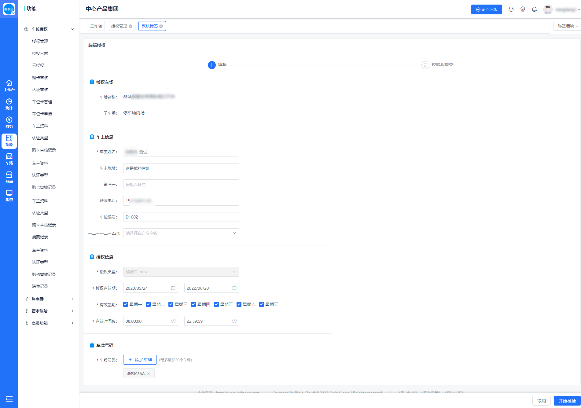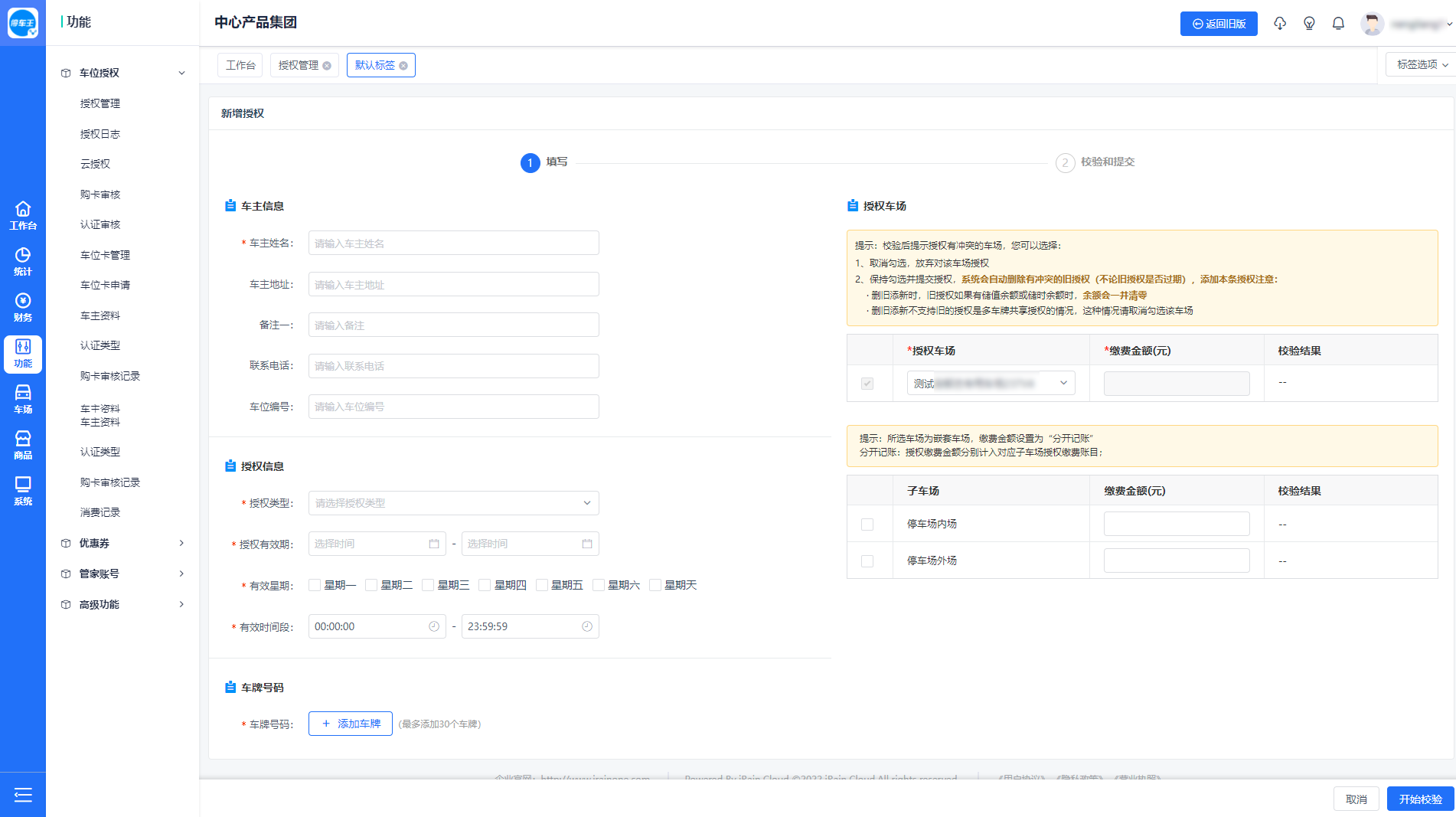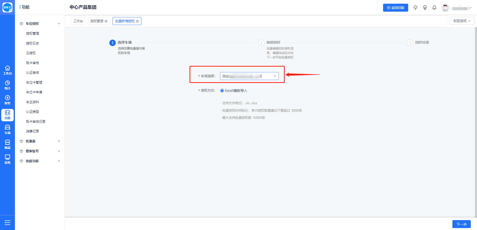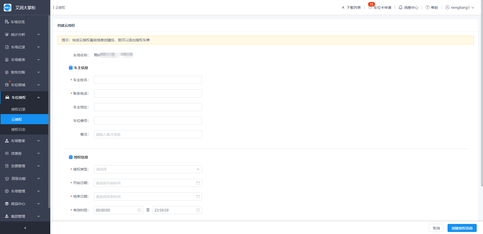 第二步: 在授权设置页面,首先确定您设置的车场名称,若不符合,您可以在 车场选择 下拉框中修改;接下来,您可以在当前页面进行功能的设置: