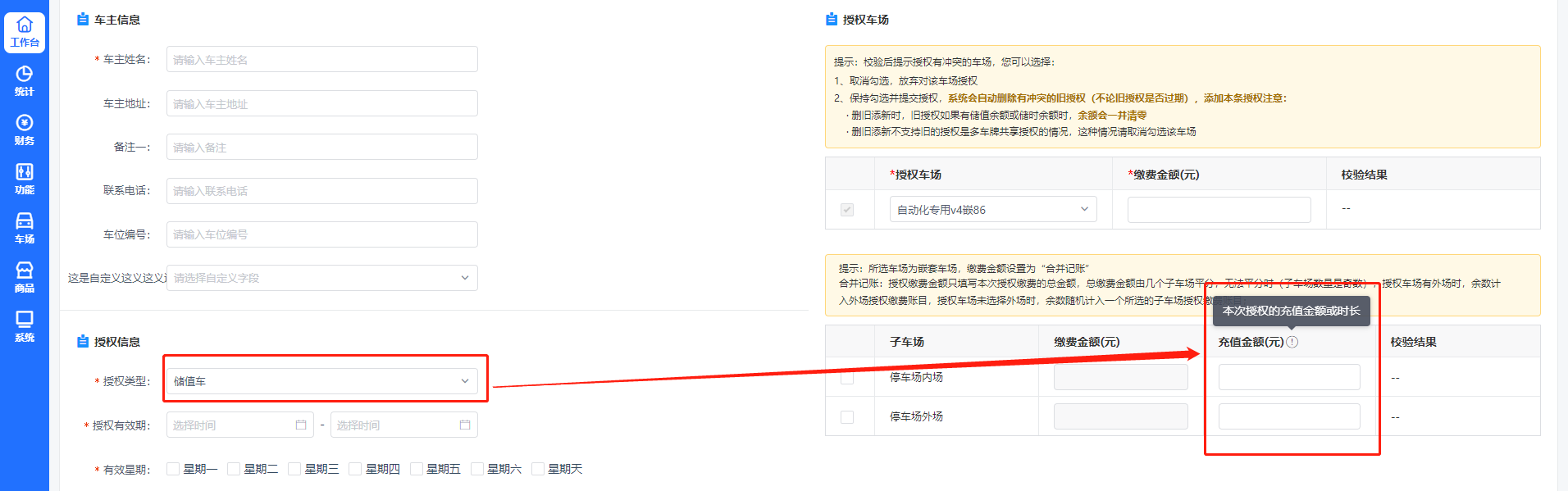 不允许一个子车场授权储值车,另一个子车场授权储时车;