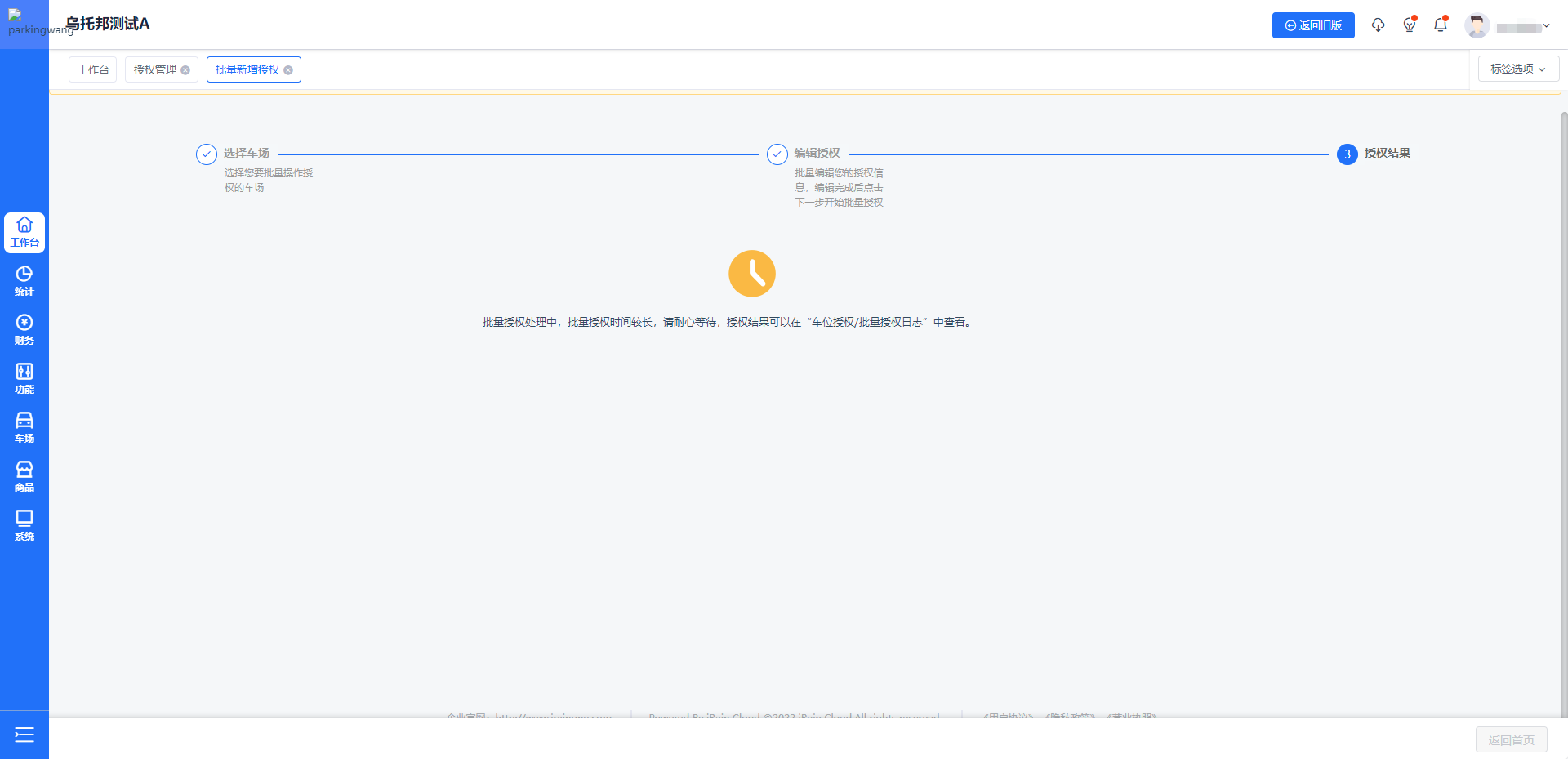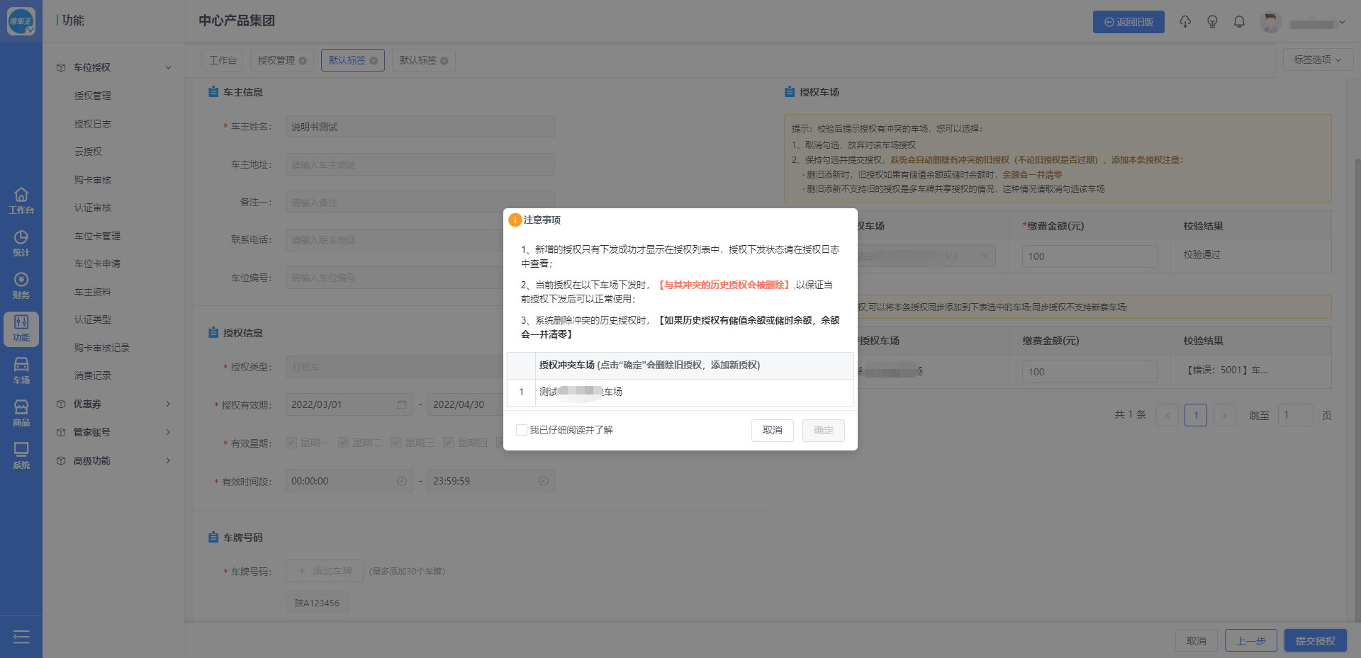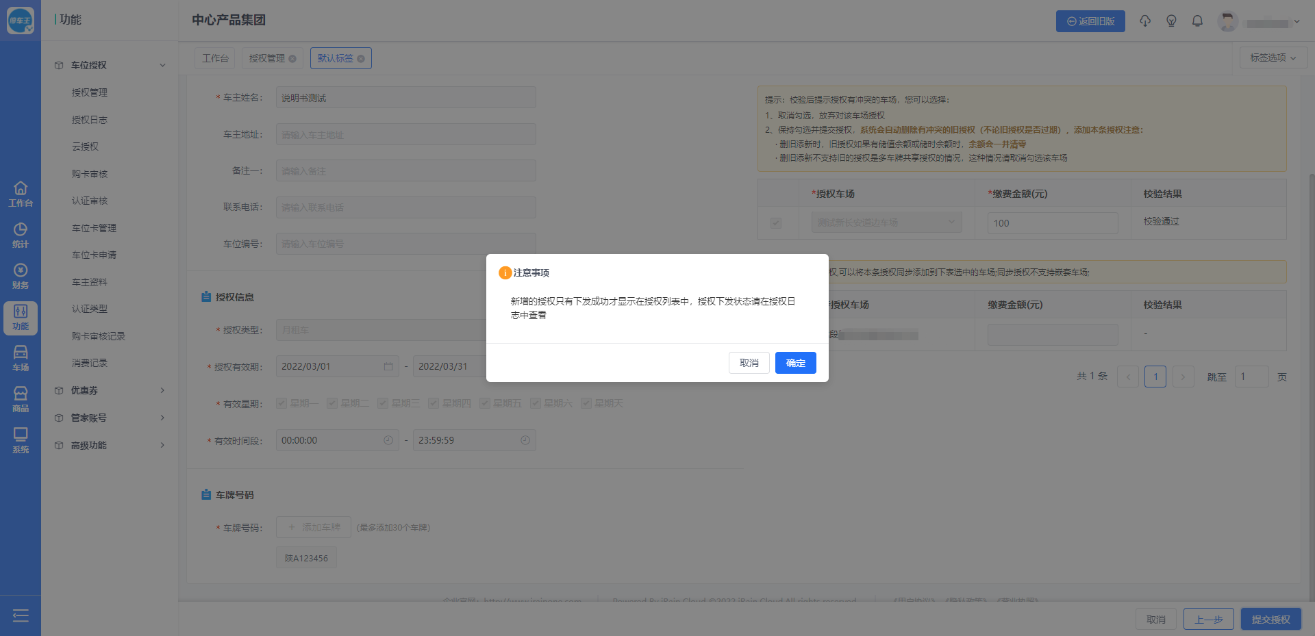通过校验的授权,点击 “提交授权” 按钮后,二次确认后,系统开始向车场下发授权。