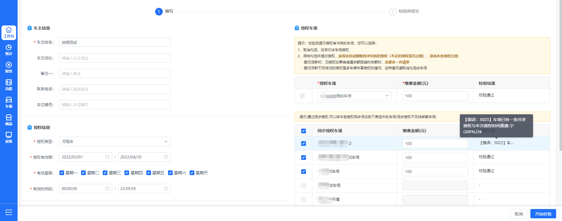 【禁止下发新授权】 如果是授权类型冲突或授权时间重叠之外的问题导致数据校验未通过,那么系统会禁止向所选车场下发本条授权。如下图:若有校验未通过的授权,系统也禁止向此车场下发授权时,“ 开始校验 ” 按钮就不会变成 “提交授权” 按钮(见下图①),您只有取消选中校验未通过的车场,然后重新点击“ 开始校验 ” ,待所有车场校验结果都达到可下发授权的状态后,才会变成 “提交授权” 按钮(见下图②)。