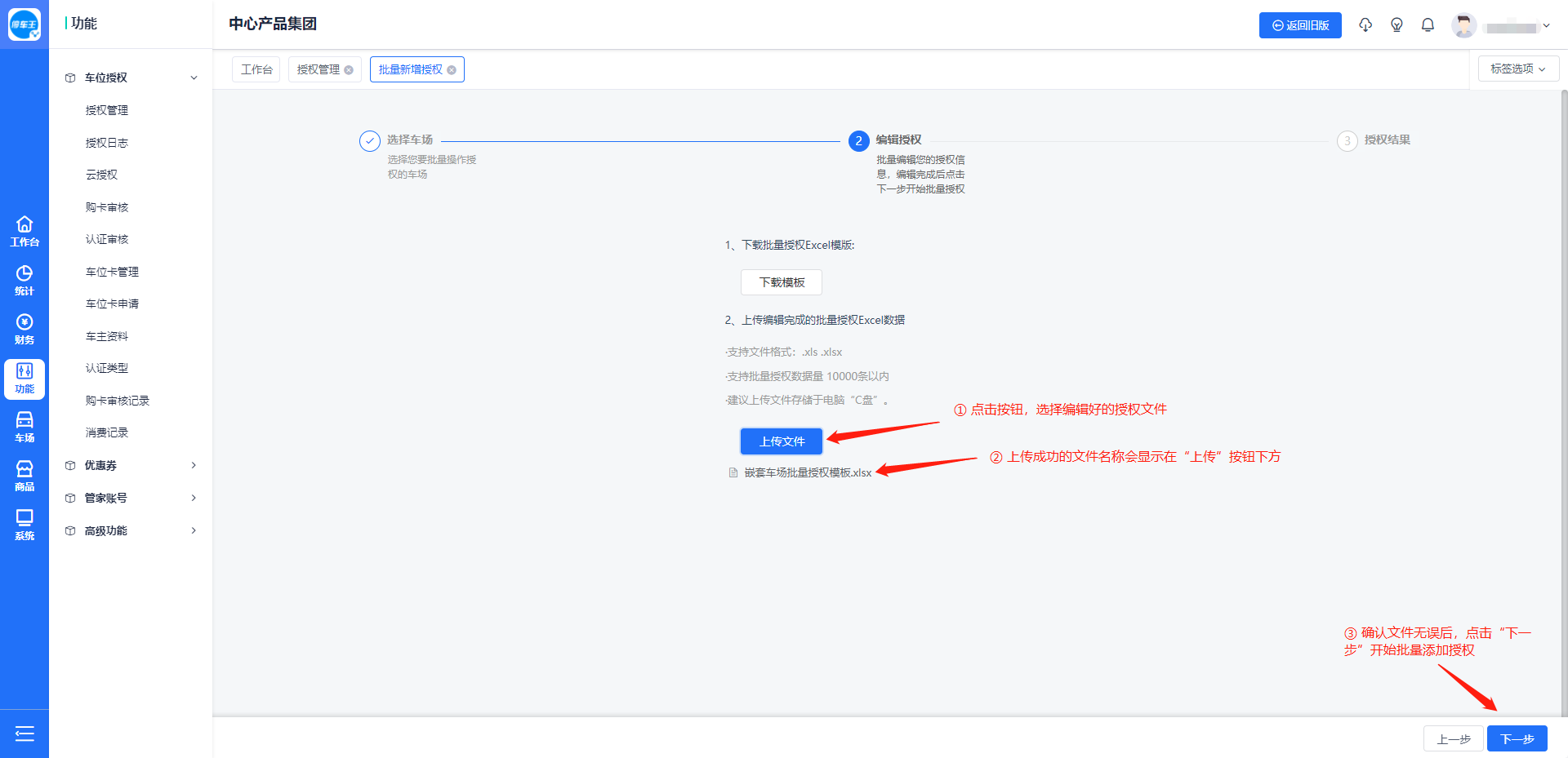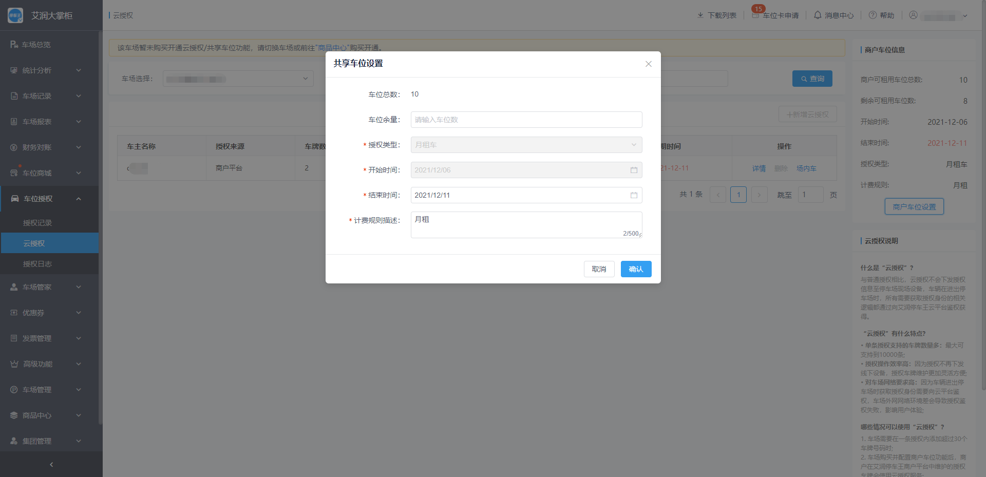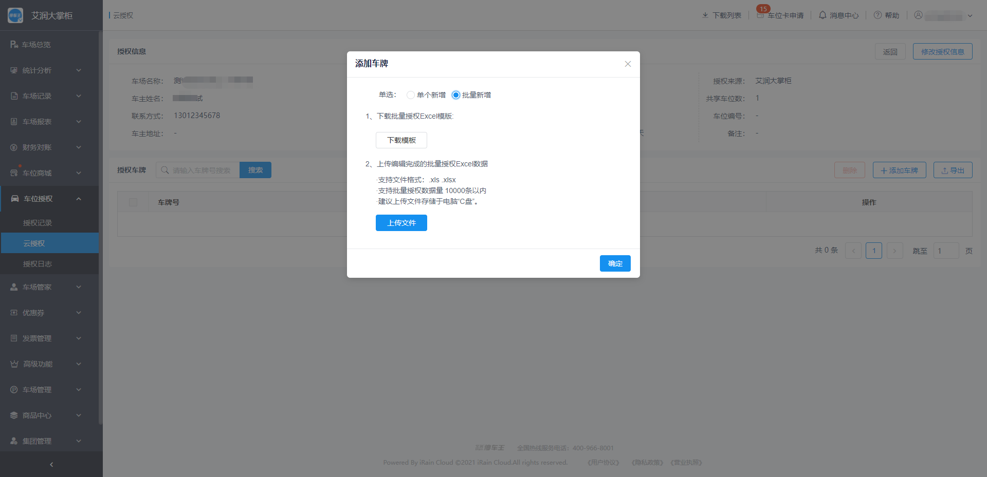 当车场需要在一条授权内添加超过30个车牌号码时,就可以使用云授权功能。