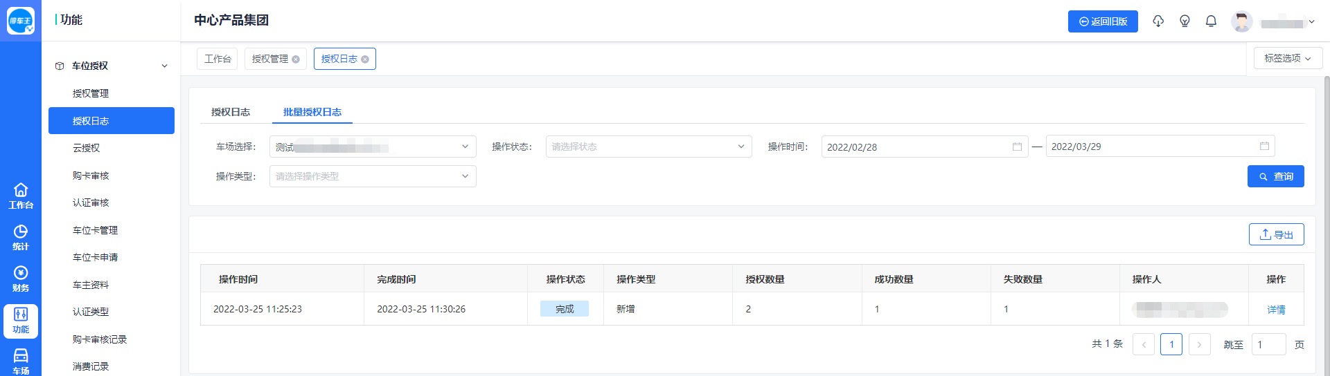 在授权日志页面,点击 “批量授权日志” 标签,即可查看车场的批量授权操作日志。