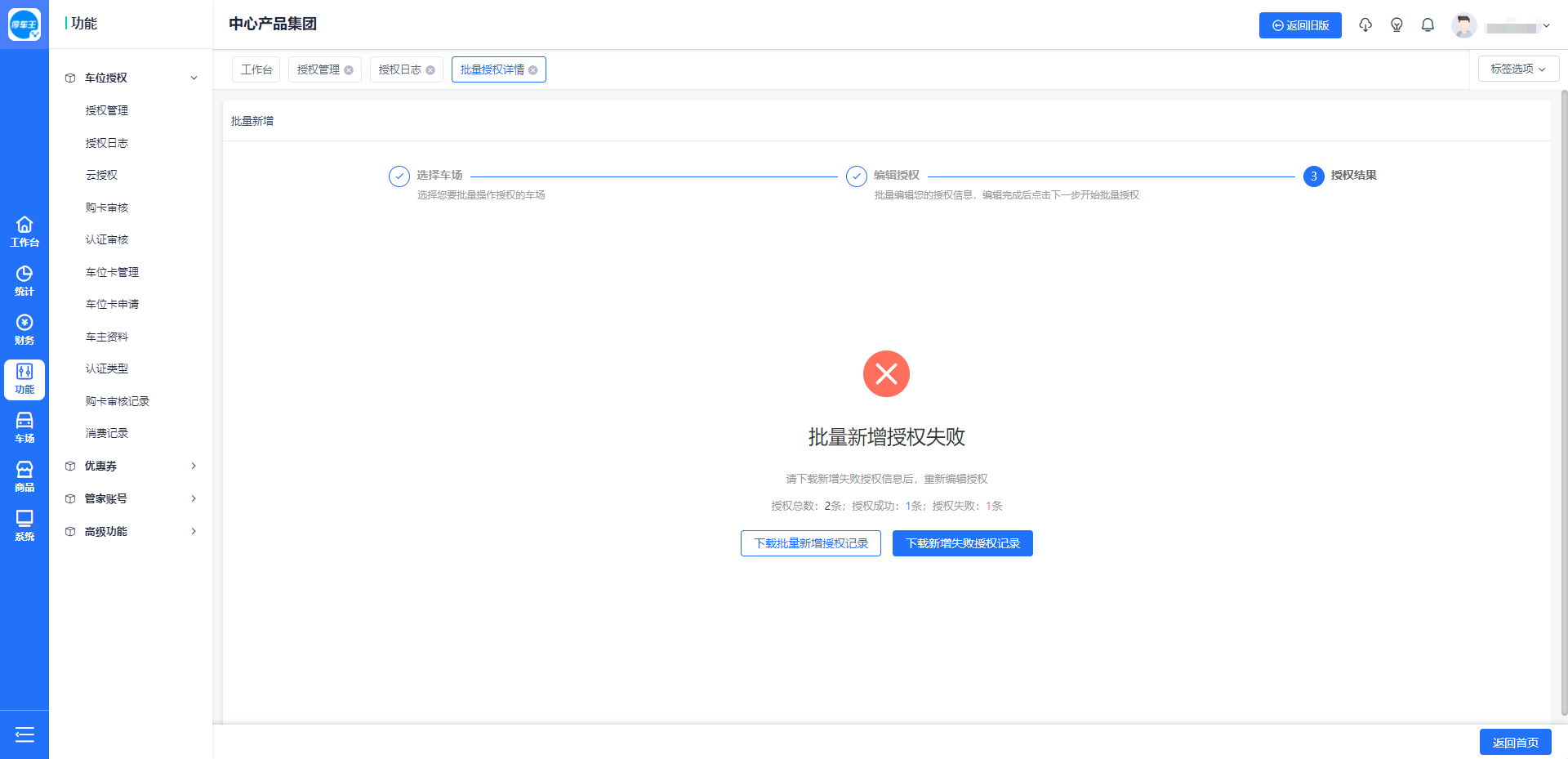 您可以点击 “ 下载新增失败授权记录 ” ,系统会为您导出本次批量操作中所有失败的授权信息,并且注明失败原因。您可以根据失败原因修改授权信息,重新操作。