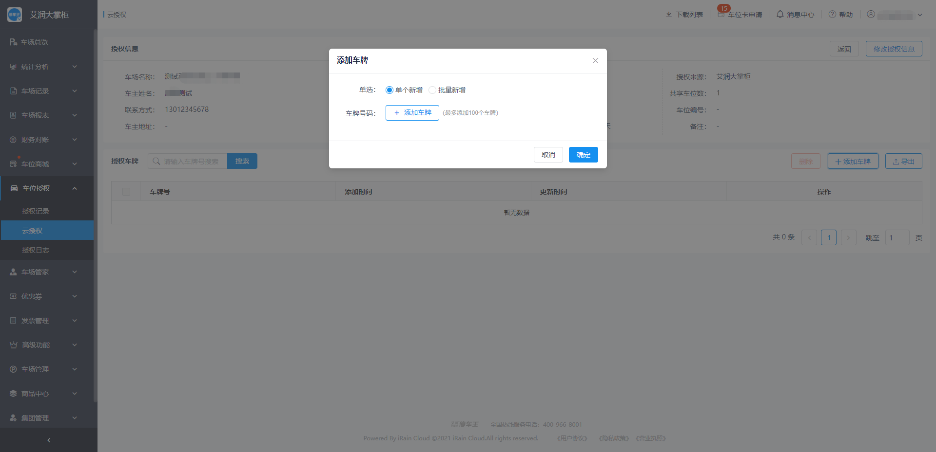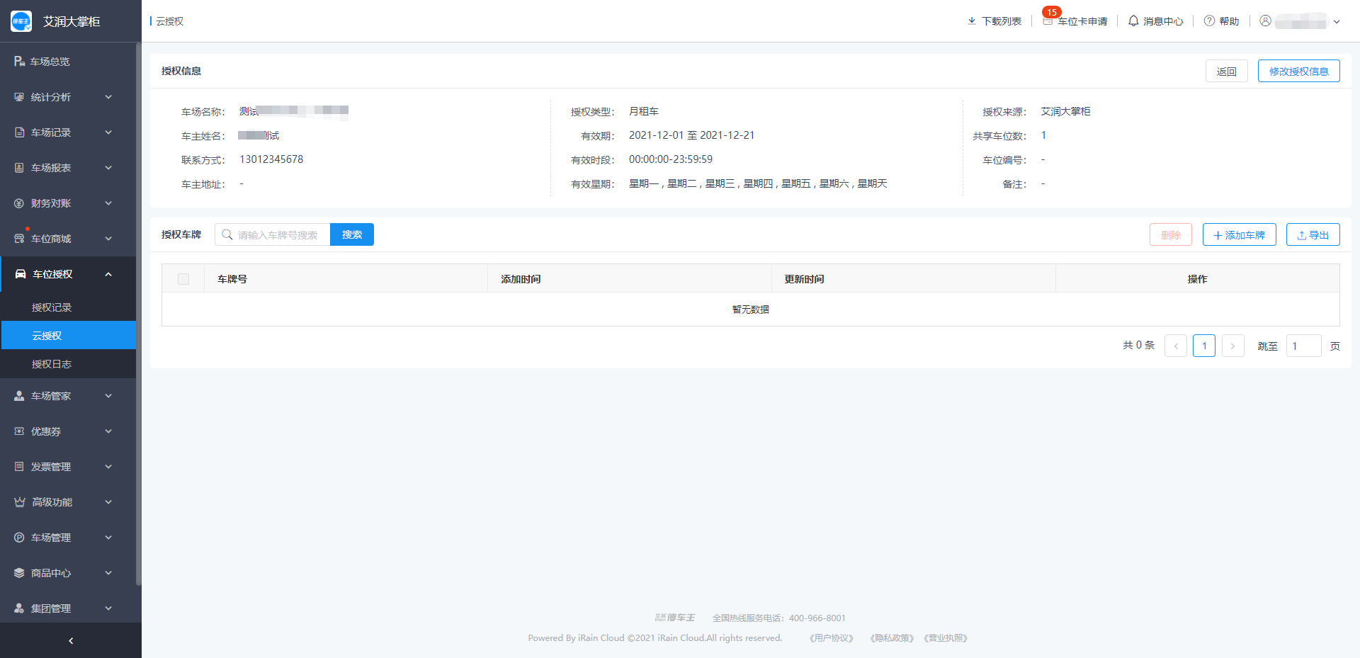 第二步:进入云授权详情页,在其中添加云授权车牌;