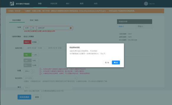 在一个车场(嵌套车场下的子车场也视为一个车场)中, 同一个车牌 :