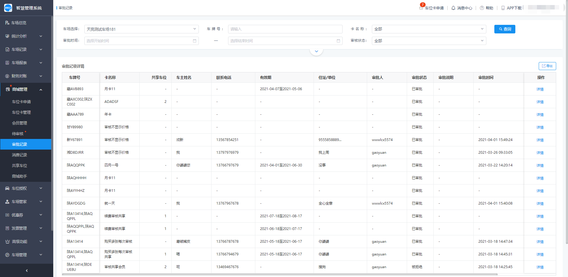 点击“车位卡申请”消息或者通过“商城管理-车位卡申请”导航栏,均可以进入车位卡申请列表页,查看车主端提交的车位卡申请需求,以及当前的处理状态和处理人;