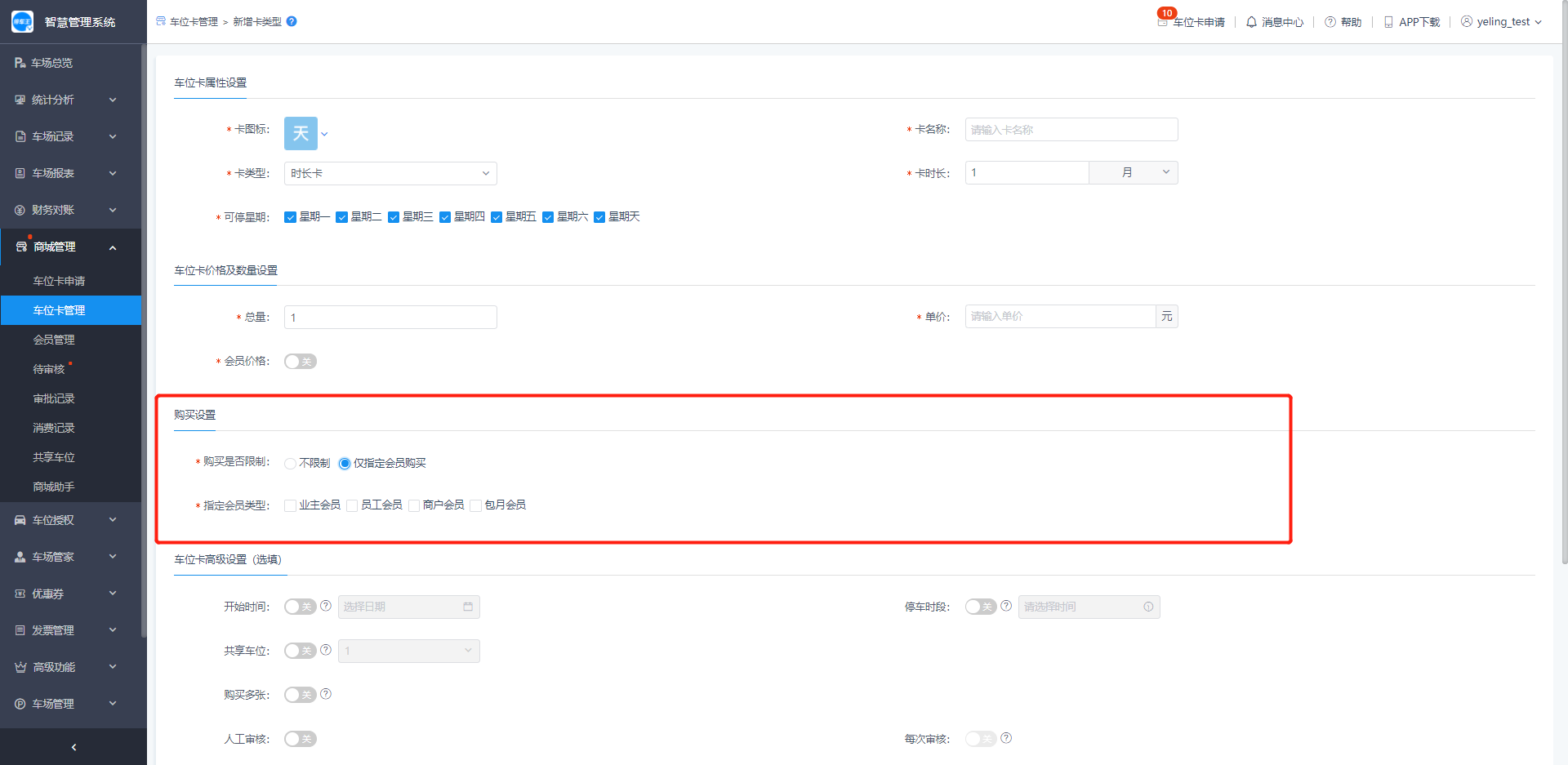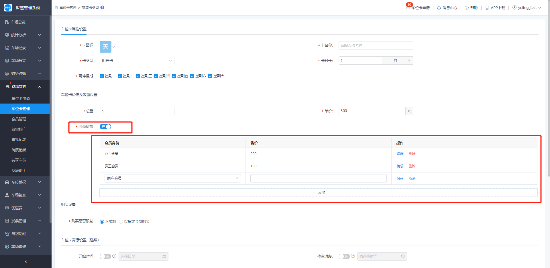车场在定义车位卡时,可以限制指定认证类型的车辆才可以购买,还可以指定认证类型的车辆在购买车位卡时支付不同的购买价格。