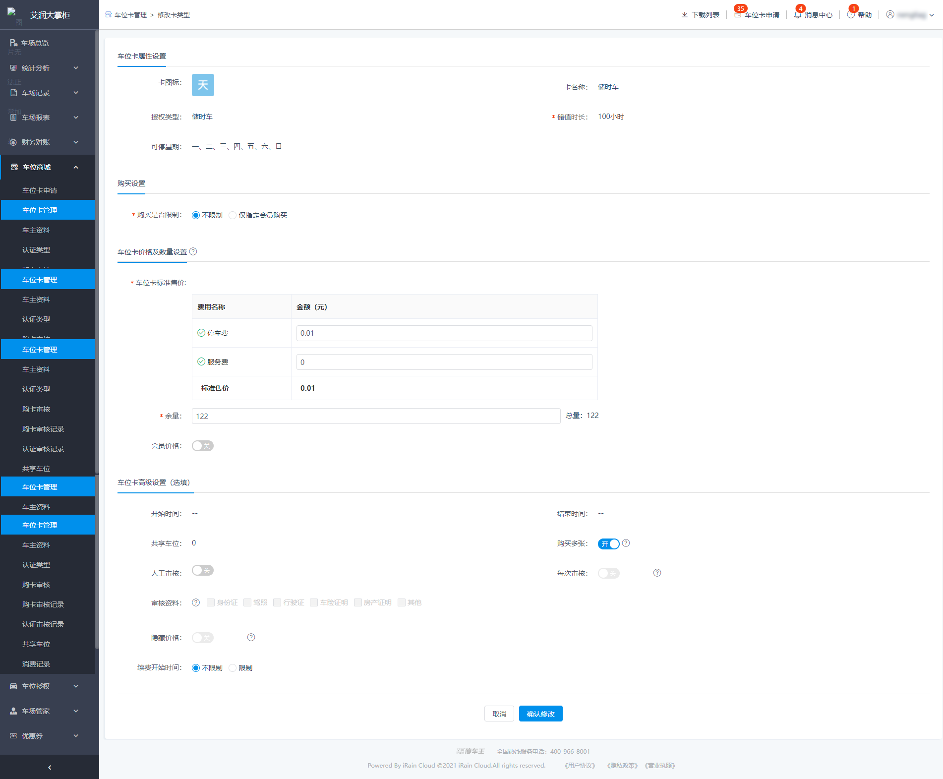 车位卡编辑可以修改车位的售价、库存余量、是否购买多张、是否需要人工审核、是否开启每次审核操作。