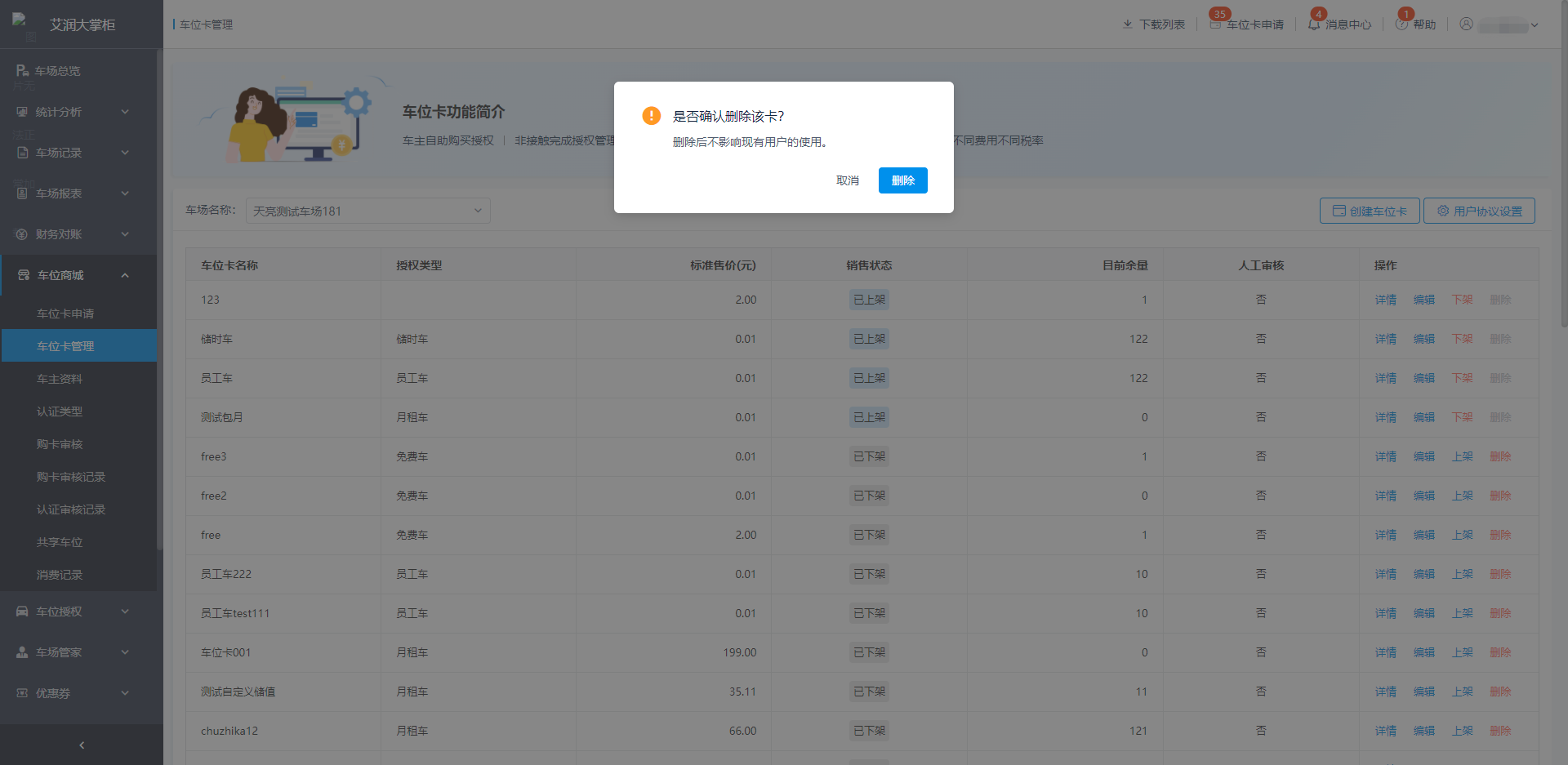 车场管理者如需彻底删除某车位卡,需要先下架该车位卡,然后执行删除操作。删除后,不影响已经购买该卡用户的使用。