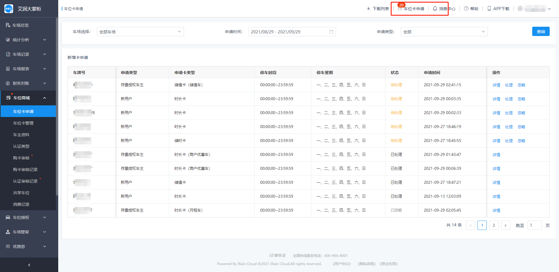 车场管理员,登录IOP系统后,可以通过顶部的导航栏获取当前有新的车位卡申请需求。