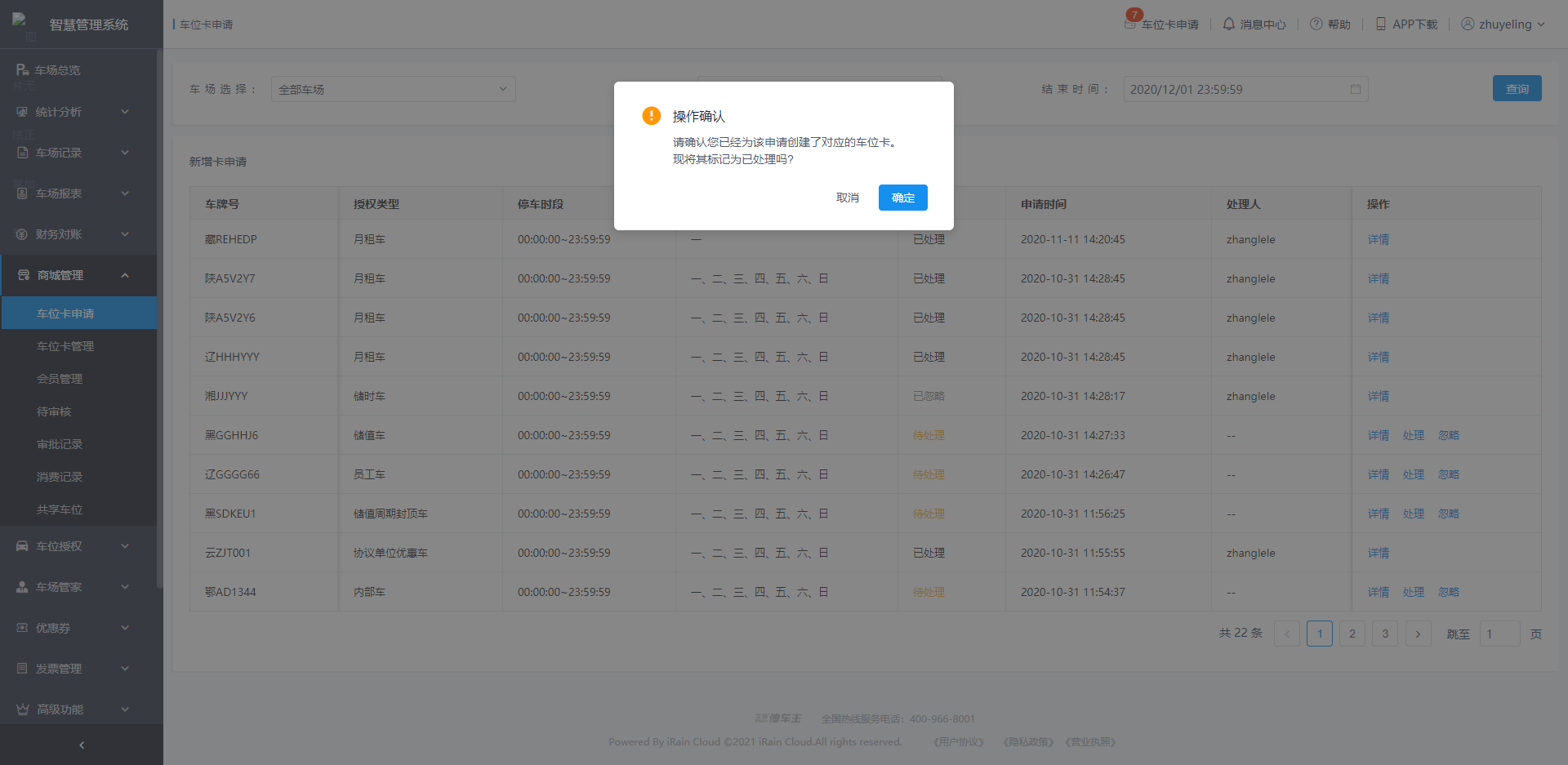 车场创建了对应的车位卡之后,可以将车位卡的申请进行标记处理或忽略;标记处理是为该申请创建了车位卡之后,建议将其标记为已处理操作;已处理或者忽略状态的申请,将不再给车场管理员进行消息提醒;