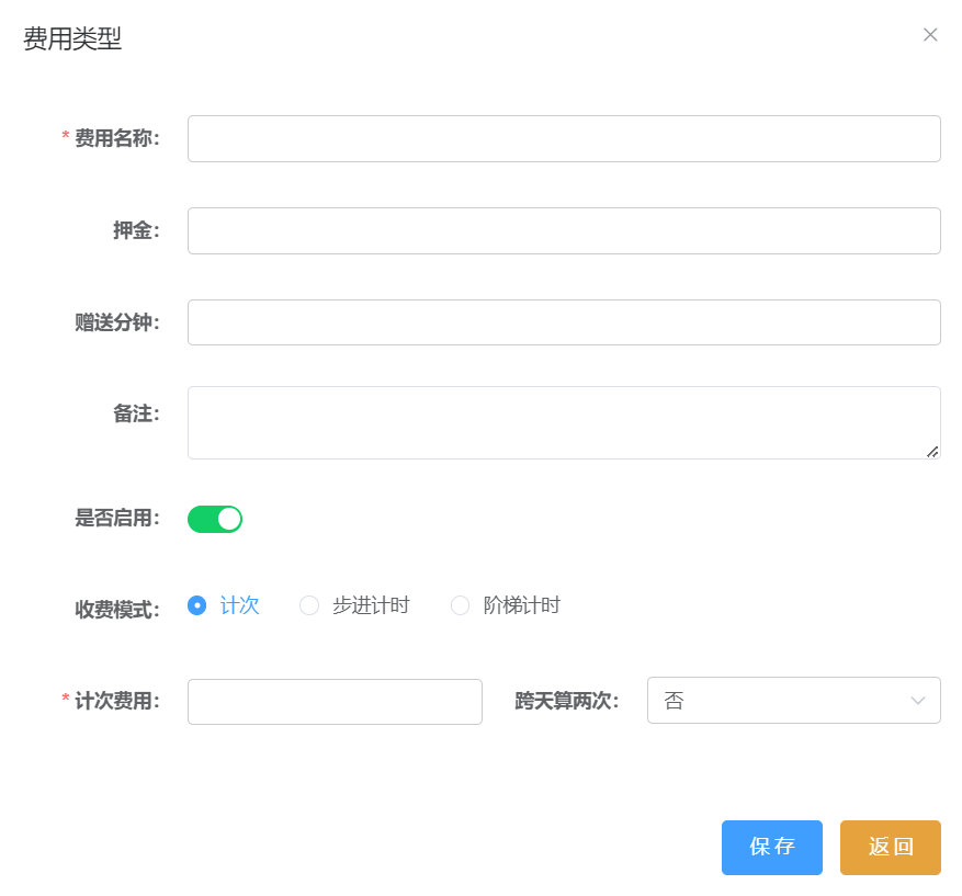 注意: 押金:收费模式不管是哪种方式,都需要设置,一般设置为封顶费用; 计次:不管多少时间,一次性计费; 步进:按固定频率时间按段收取费用,如每半小时;支持设置起步时间和起步费用; 阶梯:根据不同的游玩时间收取不同的费用,如78分钟-102分钟,收费xx元;