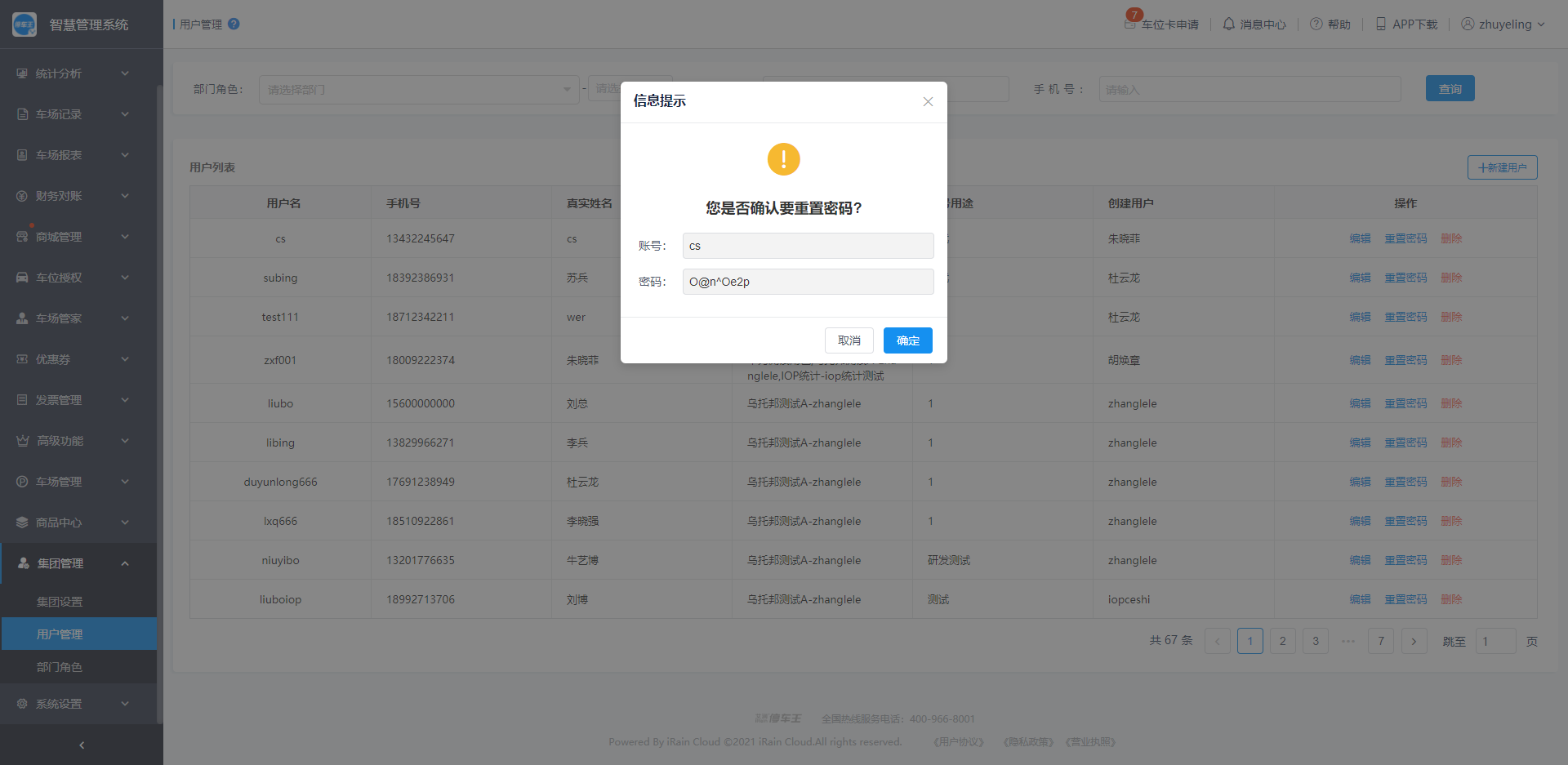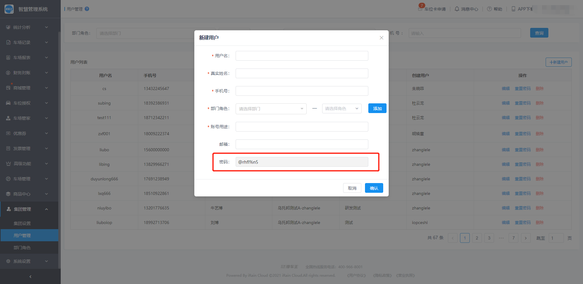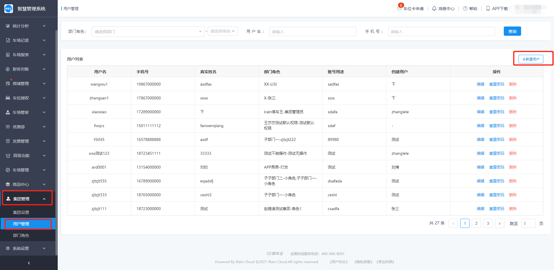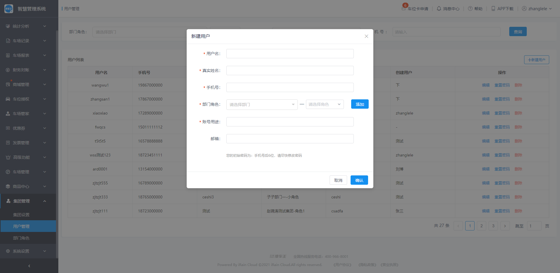 车场有多个管理人员时,车场管理员可以创建多个用户,并为用户分配响应的部门角色,从而控制新建用户对于车场的管理权限;